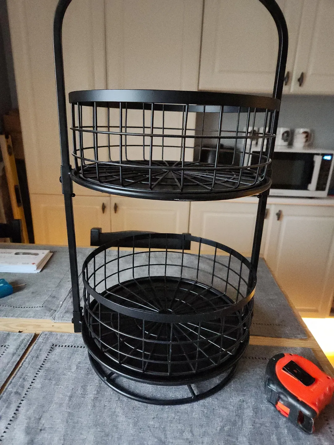 A two-tier wire basket stand in black. It's great for storing fruits, veggies, or other kitchen essentials. The wire construction allows for good air circulation. Perfect for organizing countertops or pantries! 22 inches high baskets are 11 inches removable the entire two-tier spins