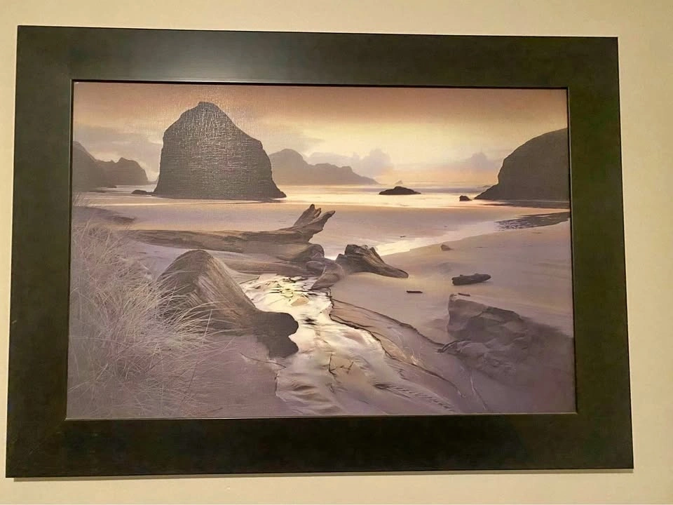 Add a touch of coastal serenity to your home with this framed beach painting, capturing a tranquil shoreline scene with a prominent rock formation and driftwood. The painting is in good condition, with the frame included, ready to hang and view. Measuring 43”W x 31”L, it’s perfect for a living room, bedroom, or office. Similar framed artwork is listed between $40 and $80, so I've priced this at $60. If the ad is up, it's available!