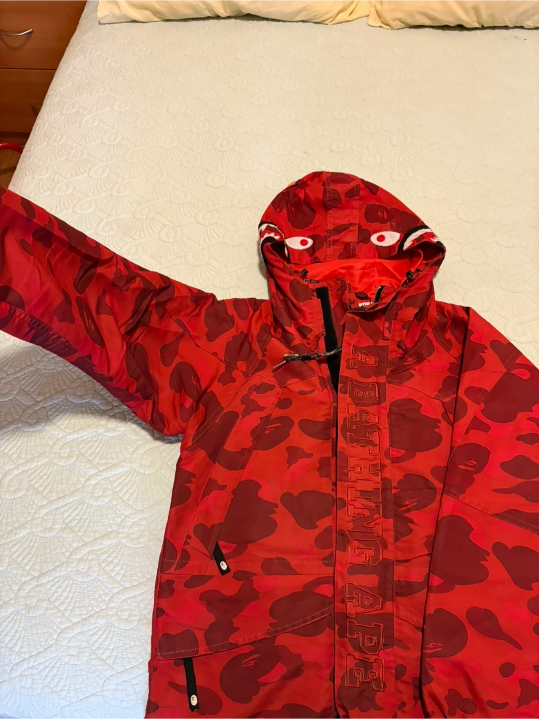 This A Bathing Ape hoodie features the iconic red camouflage pattern and shark face design. It's a size medium with a full zip front. Great for layering in cooler weather!