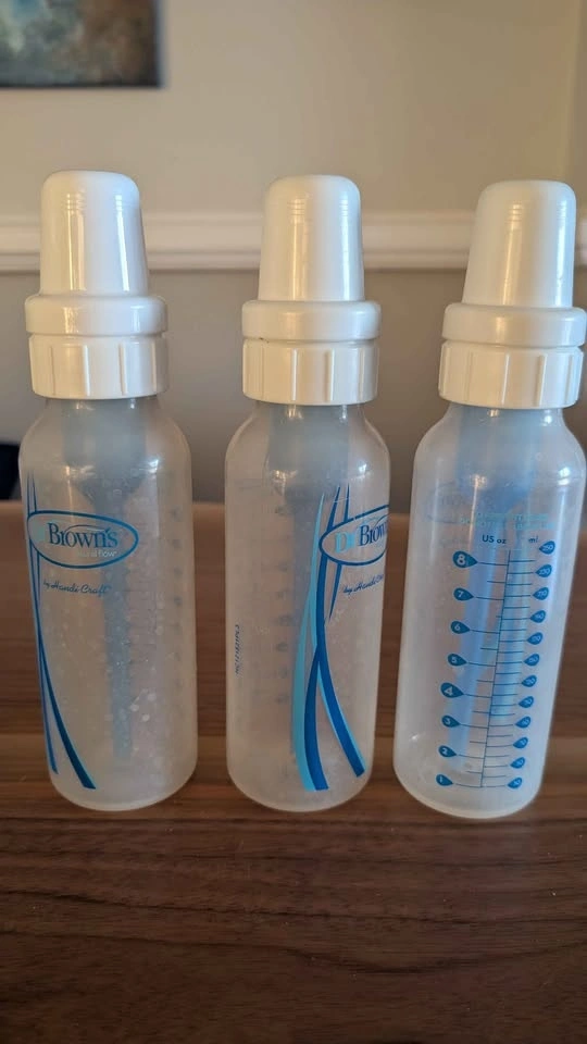 X3 8 oz bottles with vents, lids and caps. (Vents are to help with gas and colic).