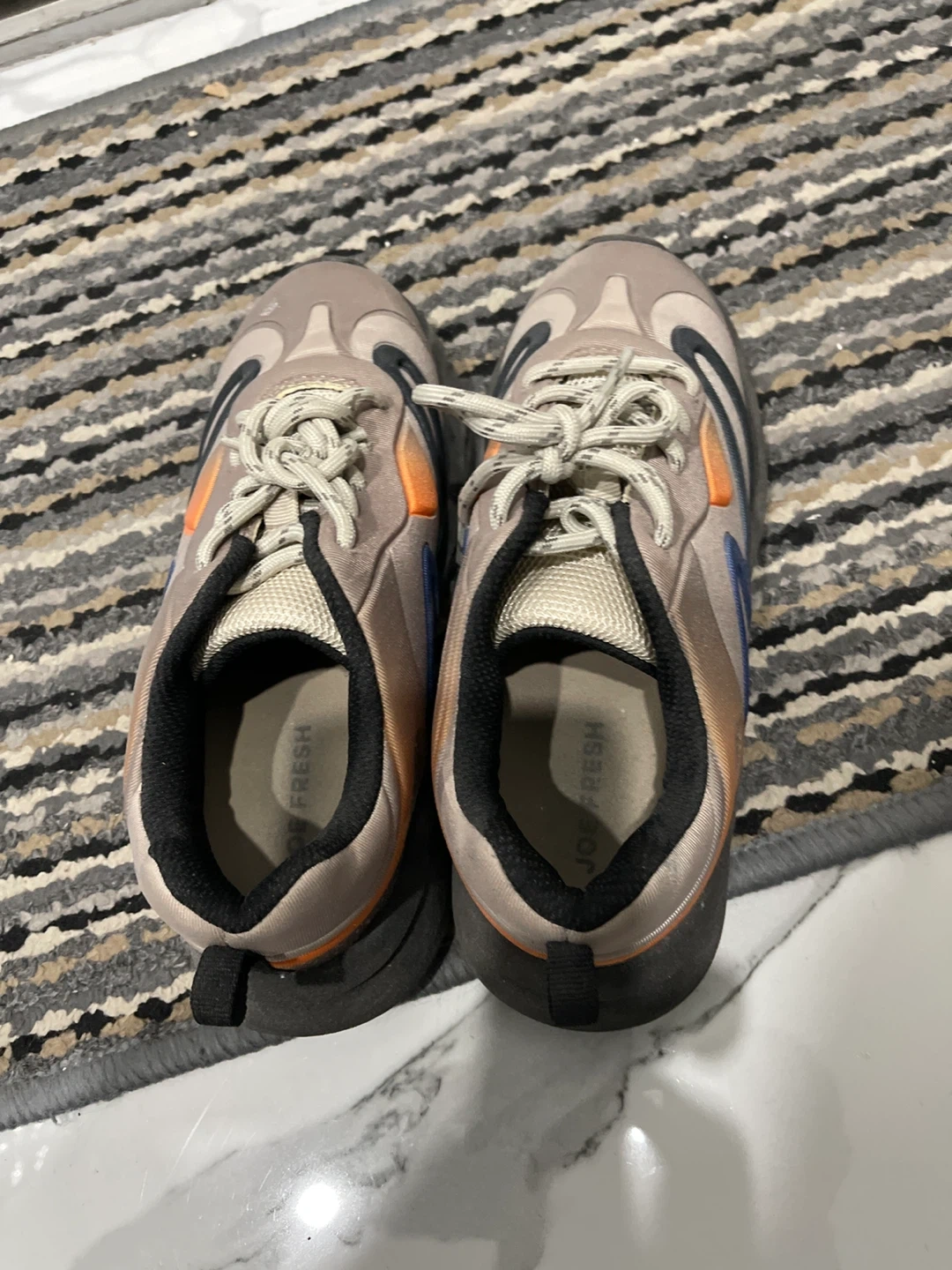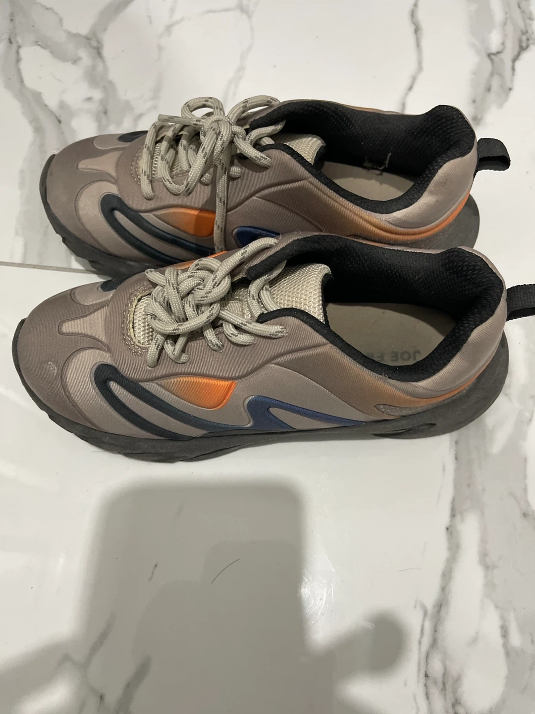 These Joe Fresh sneakers are a stylish choice for everyday wear. They feature a taupe and orange colourway with black and blue accents. The shoes are lace-up style and have a comfortable fit.