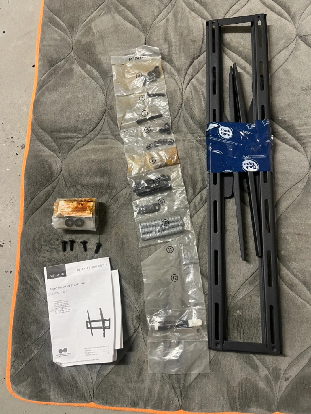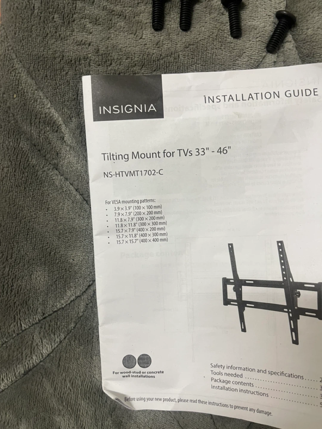 This is an Insignia tilting mount for TVs 33" to 46". It includes all mounting hardware and an installation guide. It supports various VESA mounting patterns.