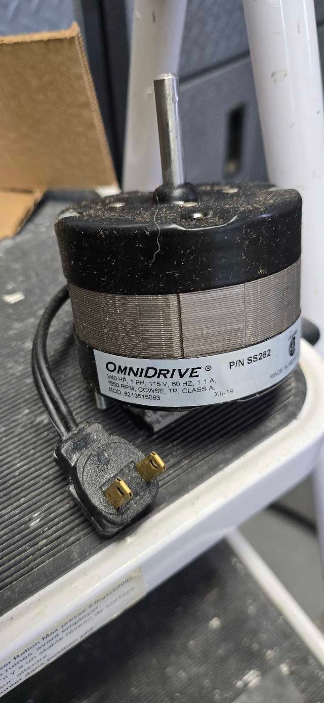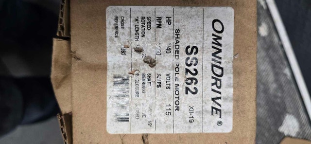 I am selling an Omnidrive SS262 shaded pole motor, rated at 1400 RPM, 1/40 HP, and 115 volts. It's in good condition and ready for use. Additional specifications include: Speed: 1400 RPM, Horsepower: 1/40 HP, Voltage: 115V, Shaft bearings: Sleeve, Enclosure: Closed. Cash accepted.