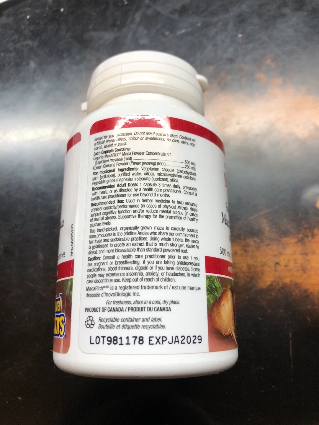 Organic MacaRich Super Strength Maca Concentrate, gelatinized 4:1. Each capsule contains 500 mg of Maca Powder (Lepidium meyenii) and Panax ginseng root. Expiry 2029.