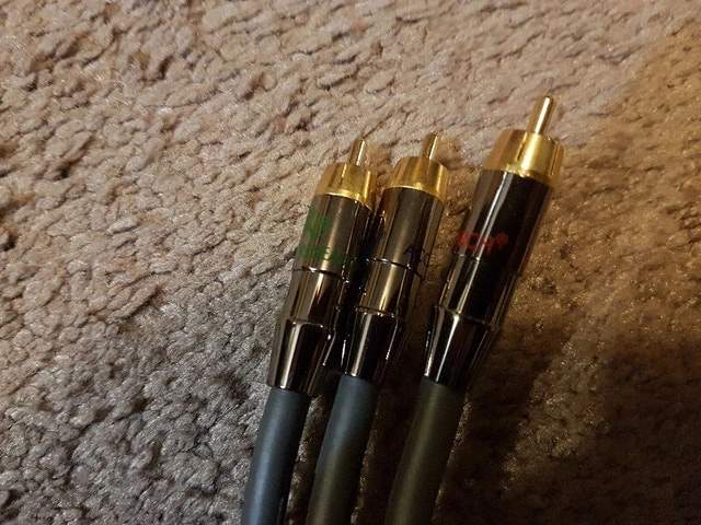 Thick, extremely durable, gold-plated Acoustic Research Pro Series 6' Component Video Cables. These cables are very high quality. Excellent condition, used once, worked perfectly. Component video cables carry video signals over three discreet paths, optimizing video signal transfer for a vibrant, more detailed picture. 6 foot component video cable. Split center pin connector. Precision machined 24K gold plated end connector. Corrosion free ends. Silver soldered internal connections. Rubber and metal grips. Polished silver coated Oxygen free copper conductors. Nitrogen injected foam dielectrics. Dense 3 outer layer multi shields.