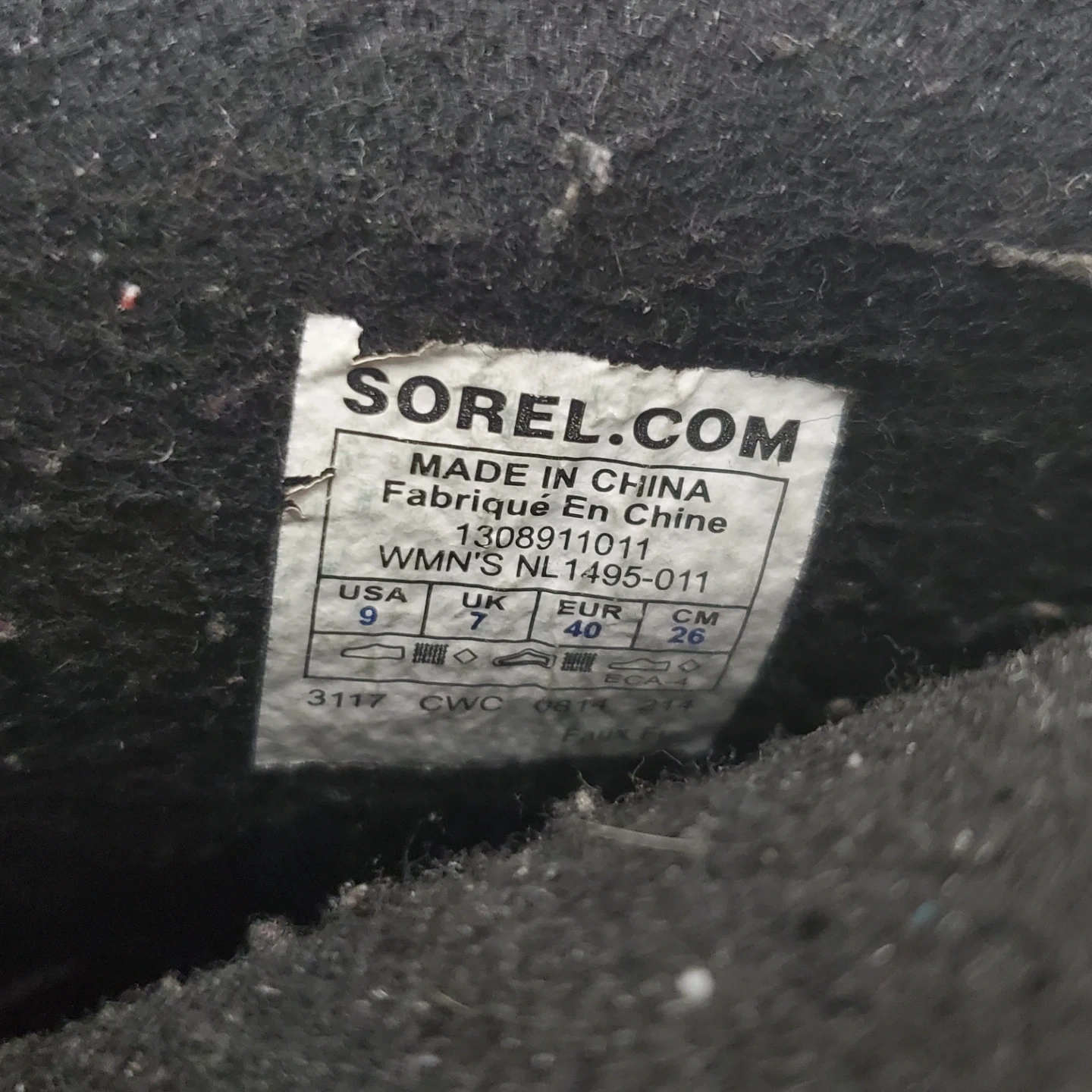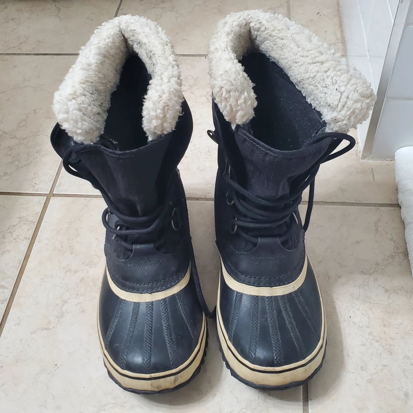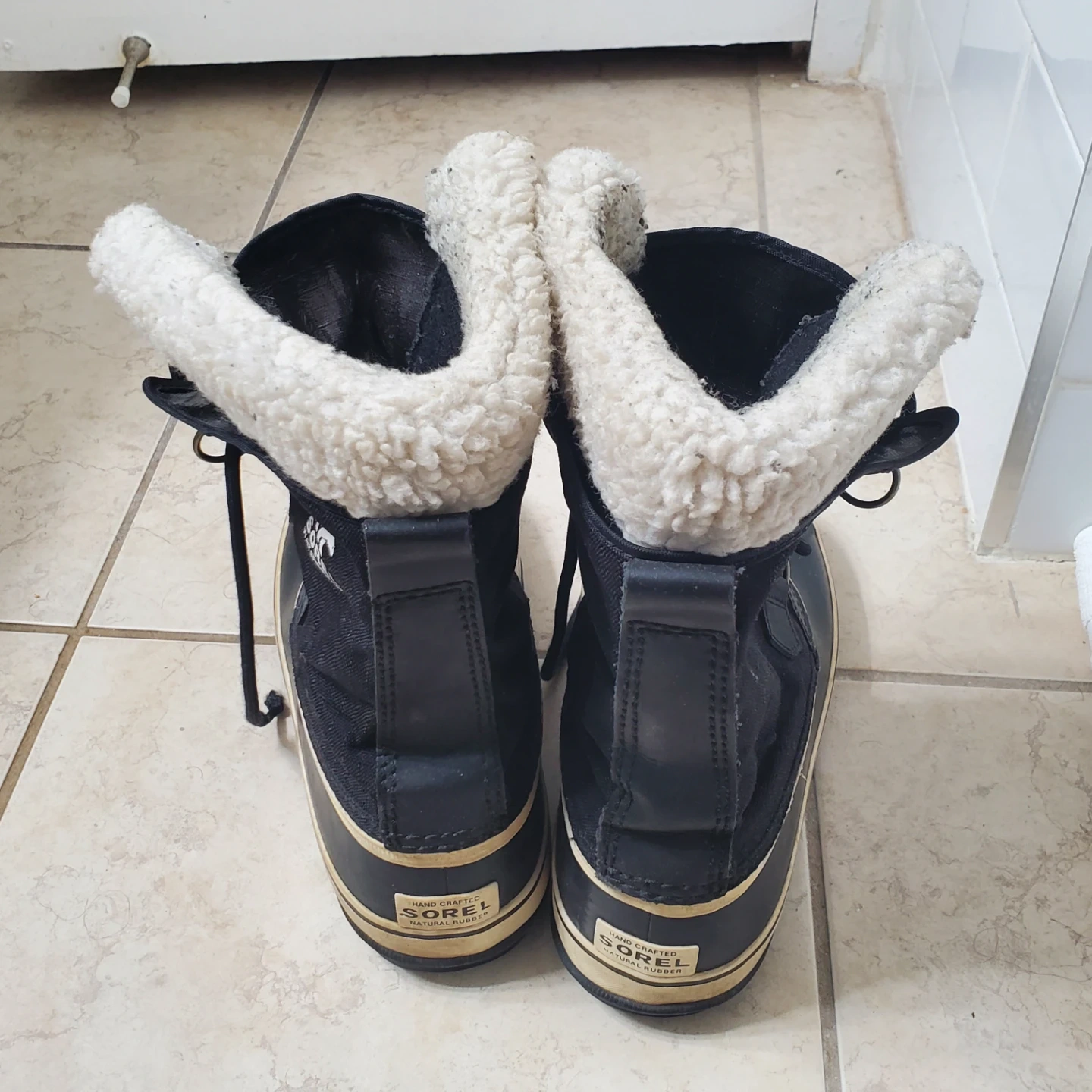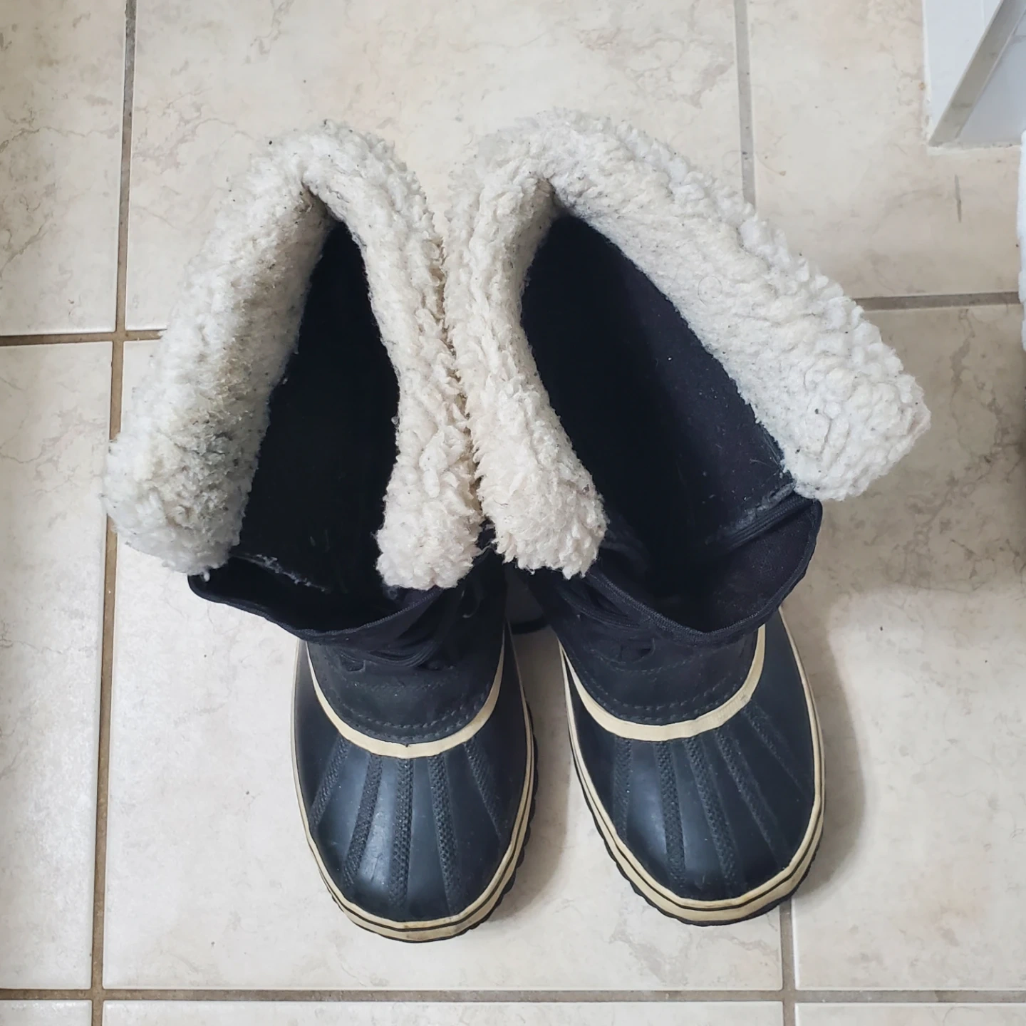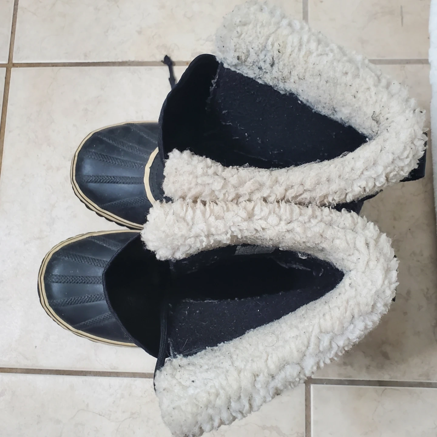 Sorel black winter boots with white sherpa lining and cream sole accent. These boots are waterproof and insulated for cold weather. They feature lace-up closure and a durable rubber base. Perfect for keeping your feet warm and dry on chilly days!
