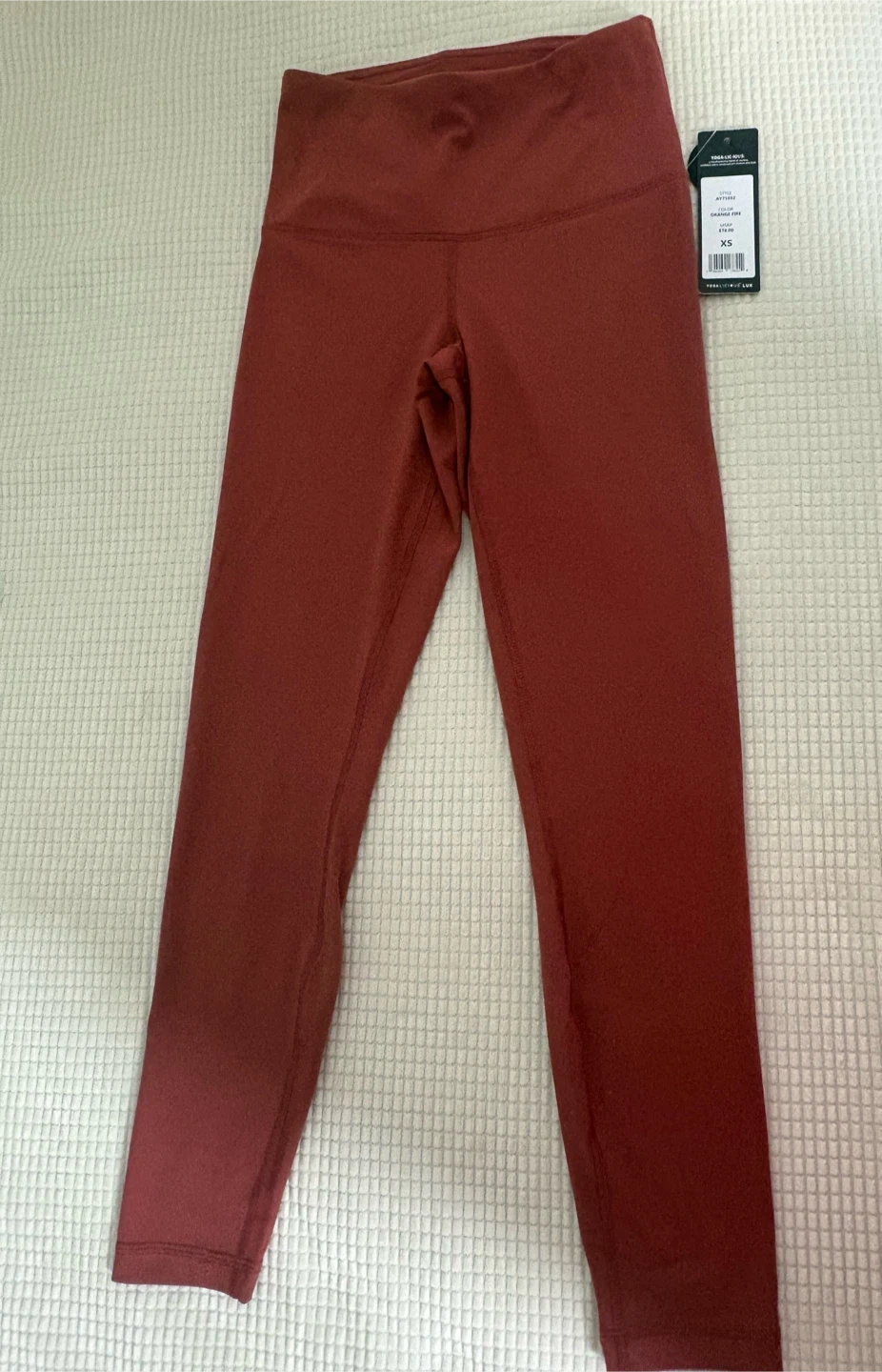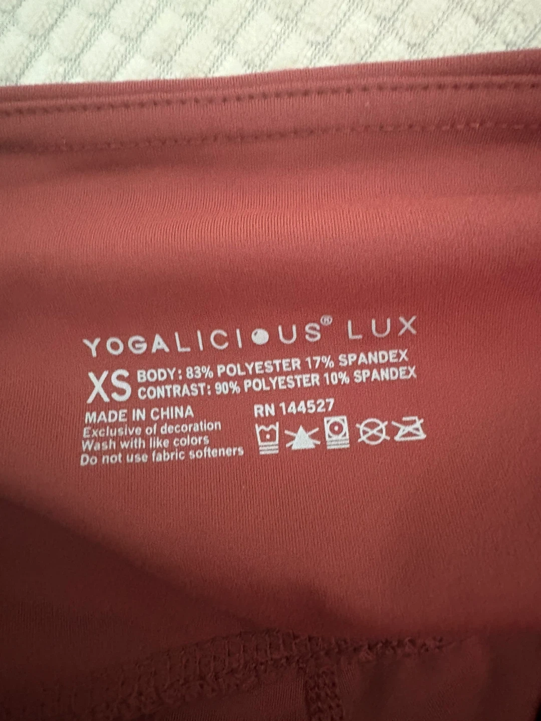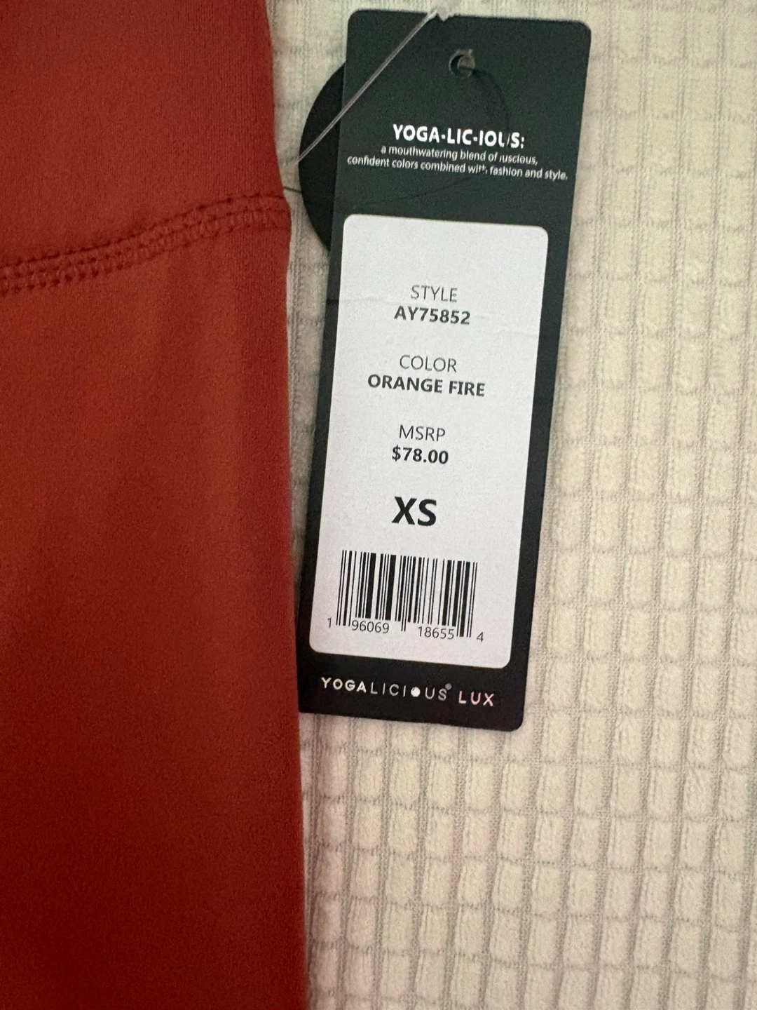 Yogalicious Lux capri leggings in Orange Fire color. Body: 83% polyester, 17% spandex. Contrast: 90% polyester, 10% spandex. Size XS. Made in China. Wash with like colors.