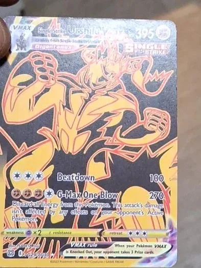 This is a Single Strike Urshifu VMAX Pokémon card, number 395. It features Gigantamax and the Single Strike style. Its G-Max One Blow attack deals 270 damage.