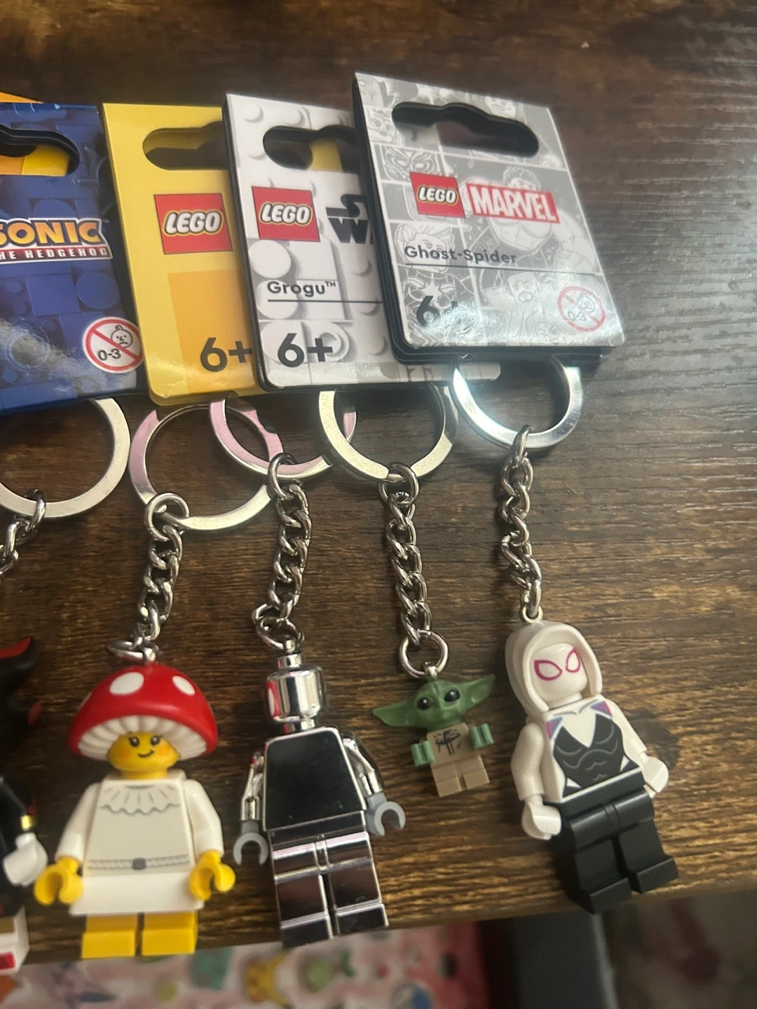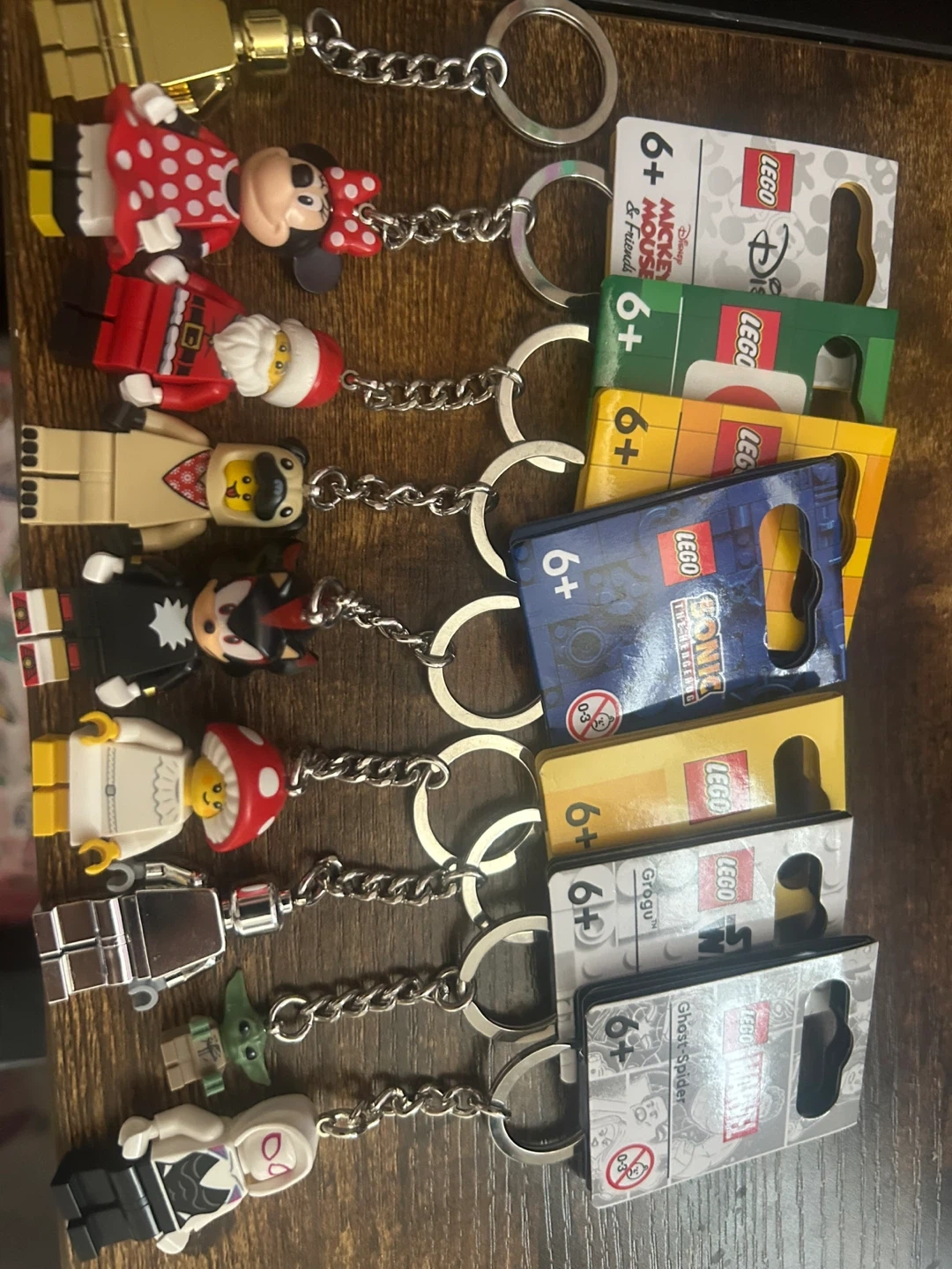 A collection of LEGO keychains featuring characters like Mickey Mouse & Friends, Sonic the Hedgehog, Grogu from Star Wars, and Ghost-Spider from Marvel. Each keychain is brand new and comes in its original packaging. Perfect for fans of these franchises!