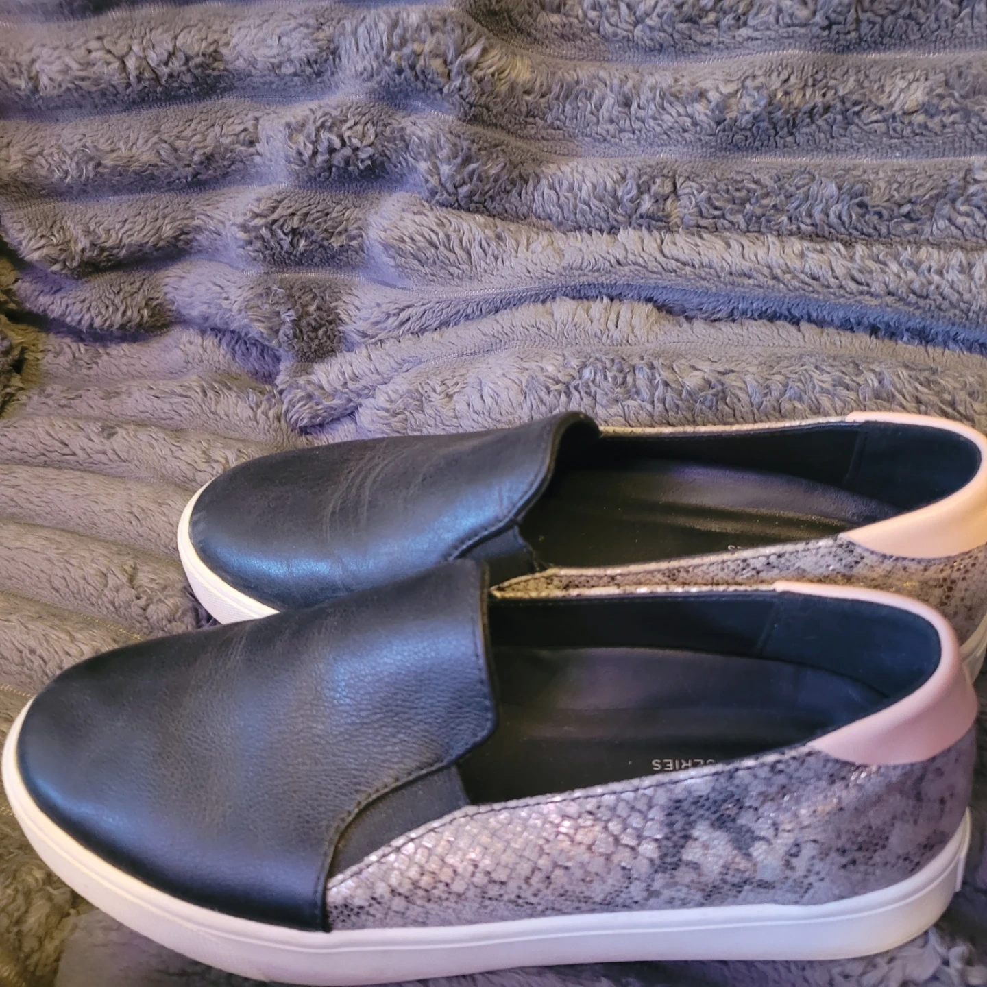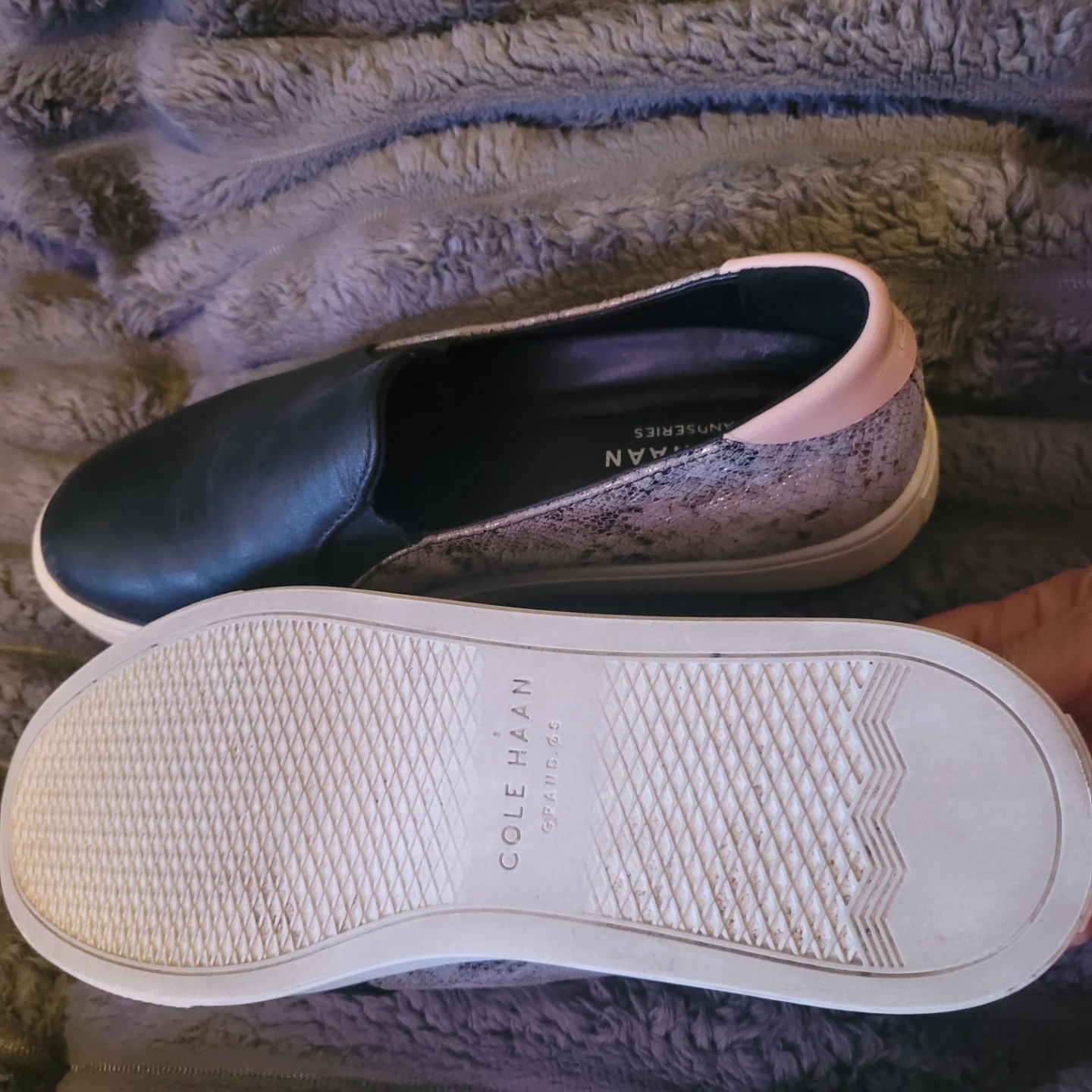These slip-on sneakers from Cole Haan are part of the Grand Series. They feature a black leather upper with a textured snakeskin-like detail on the sides and a blush pink heel accent.