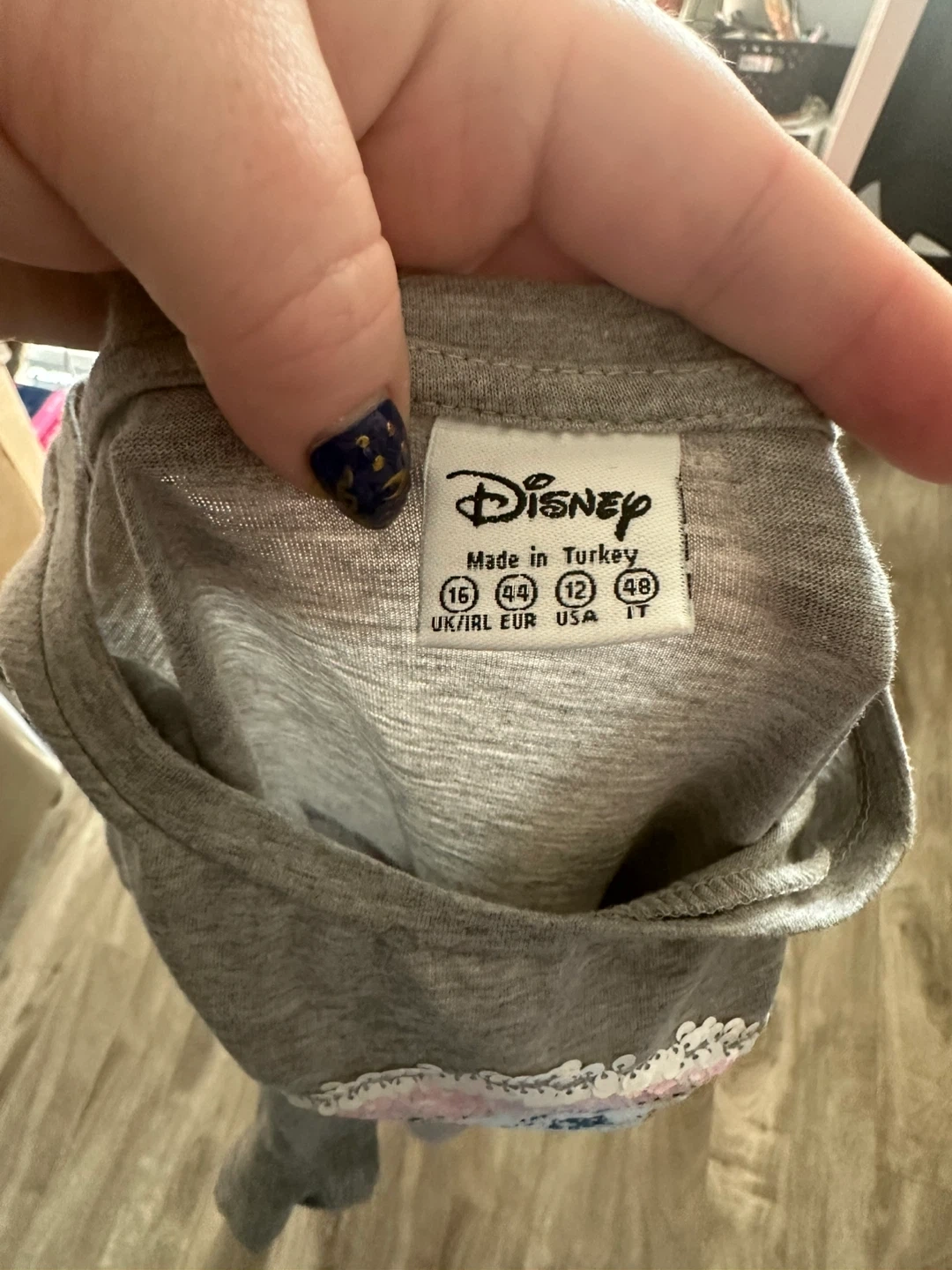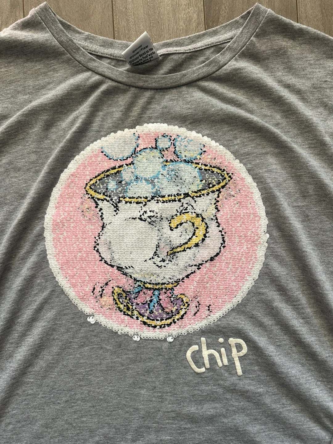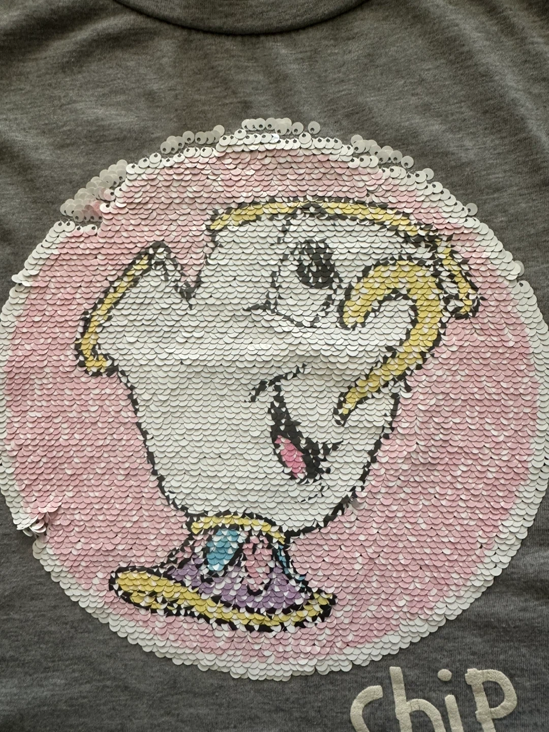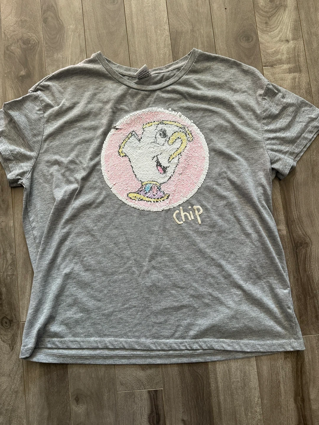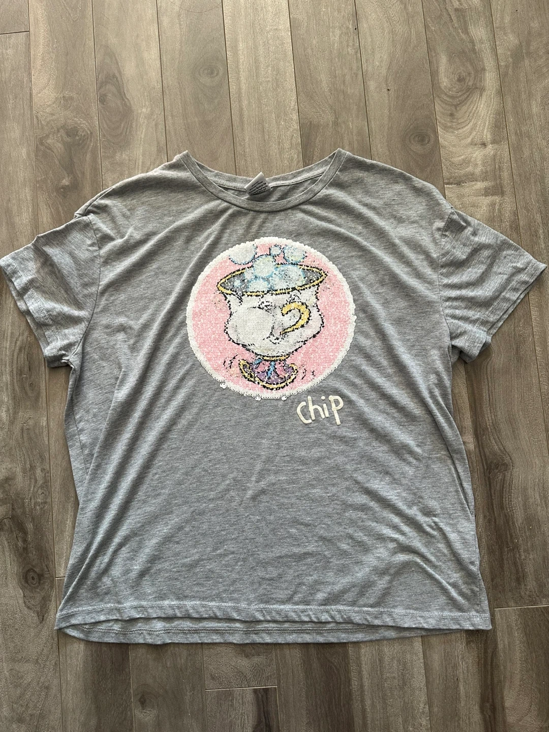 Grey t-shirt featuring Chip from Beauty and the Beast with reversible sequins on the graphic. It's made from a soft cotton blend. This tee's a fun find for any Disney fan!