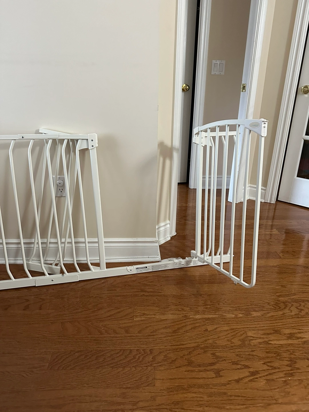 This extra long pressure mounted baby gate can be easily shortened. No screws to damage your walls and doorways. Has gate that can be opened to allow getting in and out easily without removing it.