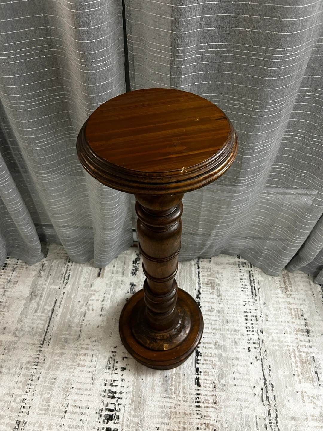 This is a beautiful vintage wooden pedestal stand with ornate detailing. It's ideal for displaying plants or decorative items. Its sturdy construction makes it a lasting addition to your home decor.
