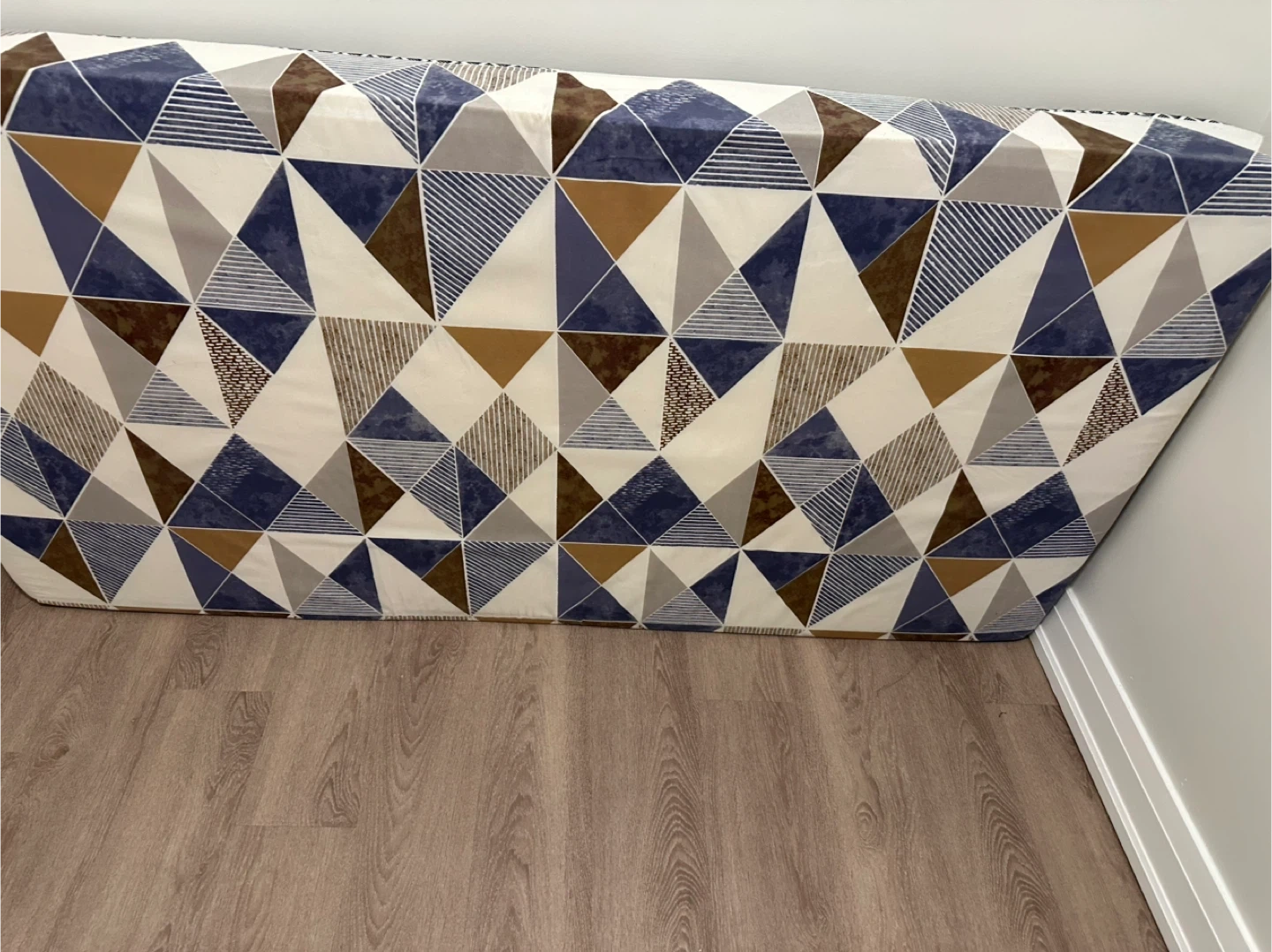Moving out sale Only 1 time use we buy $150 its good quality This is a toddler mattress featuring a modern geometric pattern in blue, brown, and grey. It's designed for cribs or toddler beds. The cover is made of a durable, wipeable fabric. With wraping plastic moving out sale