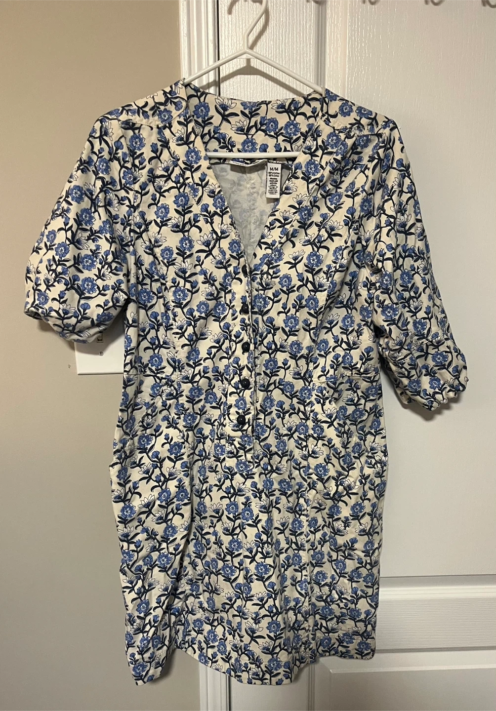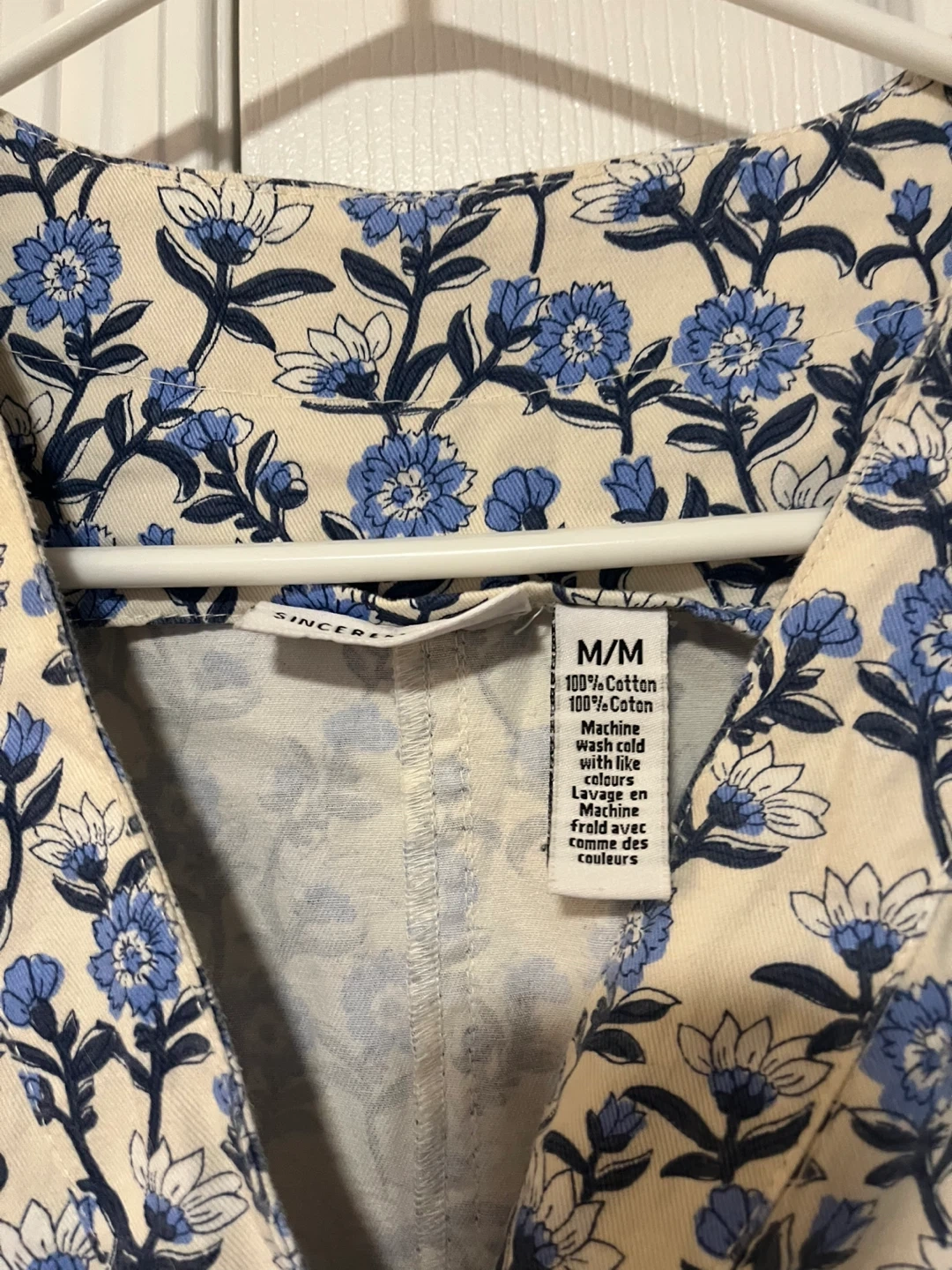 Selling a lovely Sincere Sally dress with a beautiful blue floral pattern! The size is M and it's made of 100% cotton. Perfect for a casual day out.