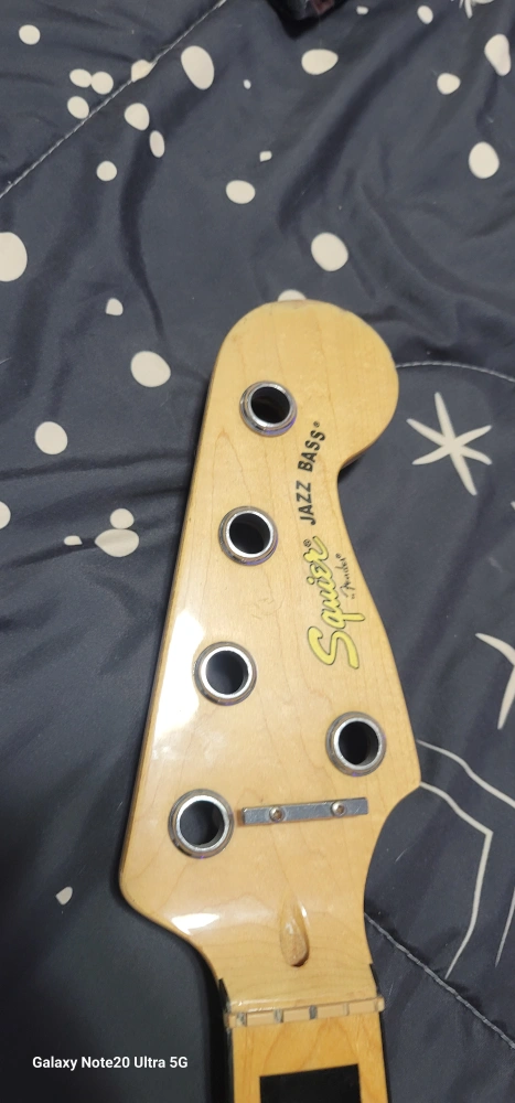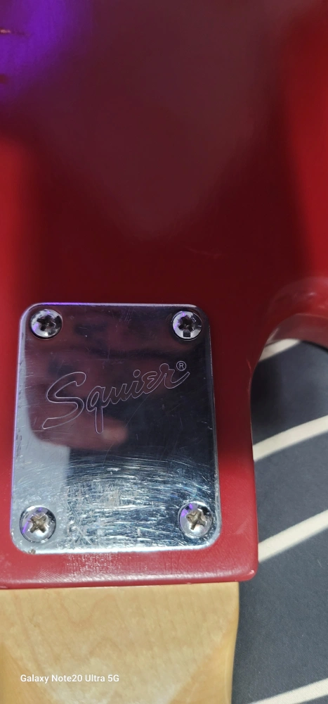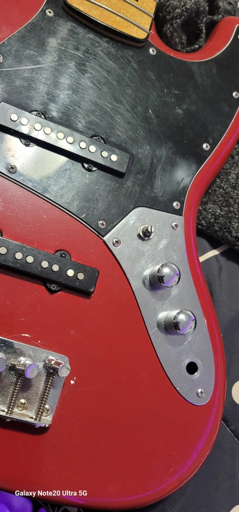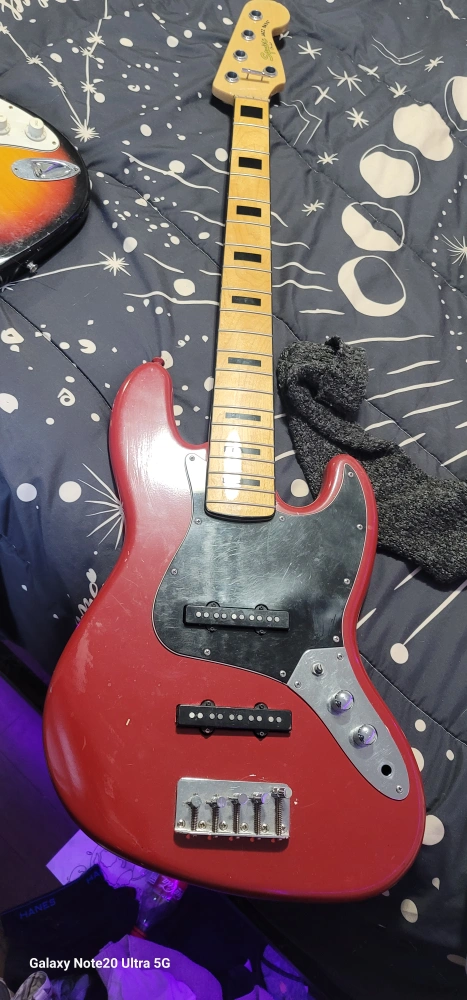 Red Squier Jazz Bass. Has two pickups and a single knob. The headstock is in good condition. There are some signs of wear and tear on the body. It definitely needs work but is good for project. 150