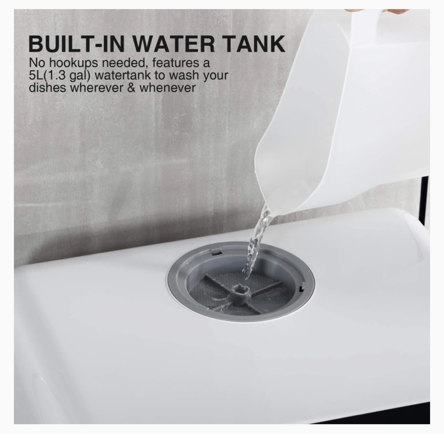 Water Source: Kitchen Sink (Faucet) Hookup or Built-in Separate Water Tank. The water tank is a great option if you have difficulty attaching and securing water hoses, or if you want to wash dishes far from a sink. Water hose is included for a direct water hookup to kitchen faucet (may need to use adapter).