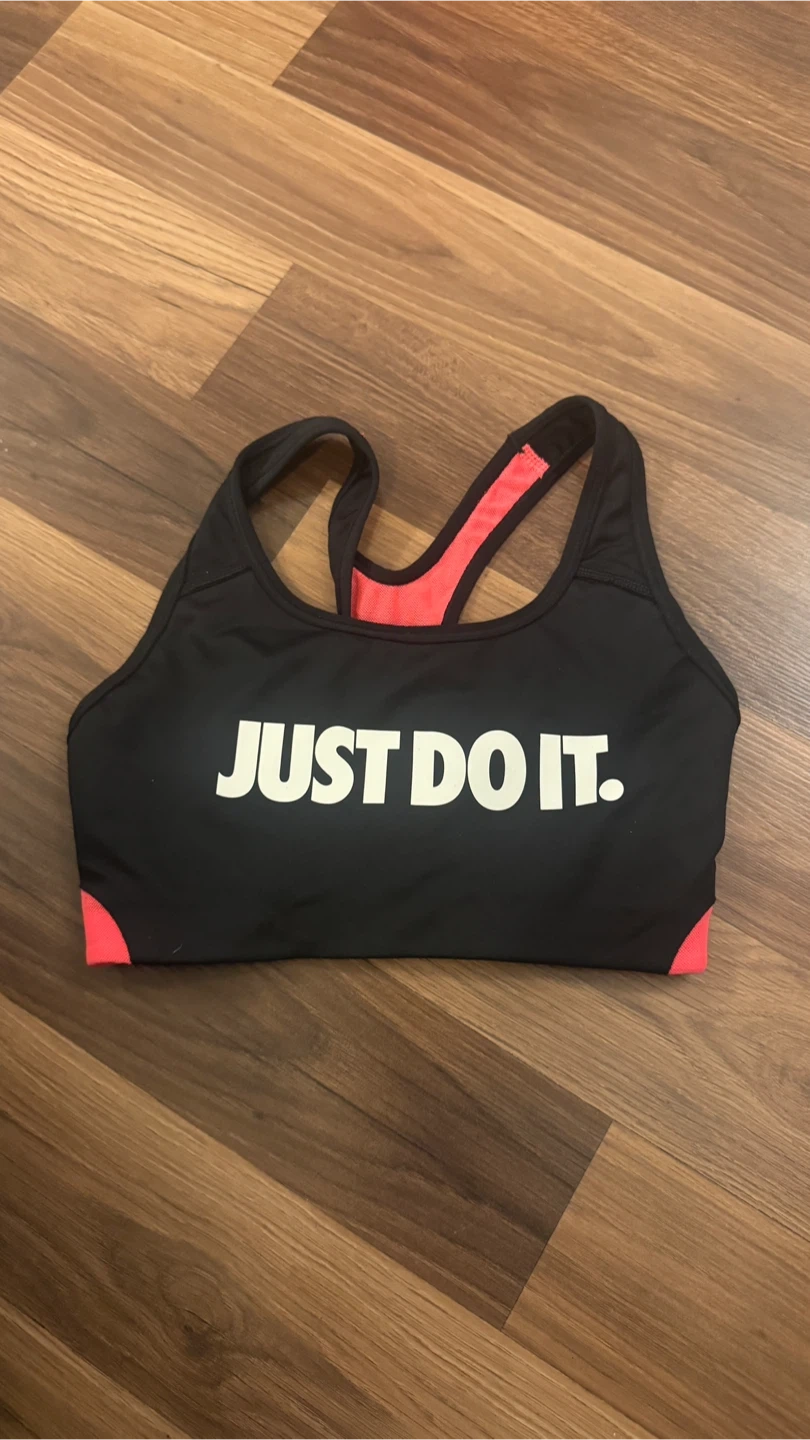 Selling a Nike sports bra in black with a pink accent. It features the iconic "JUST DO IT." slogan on the front. Worn a few times