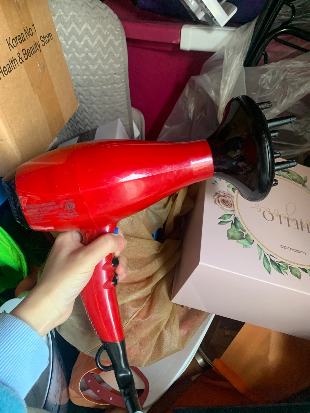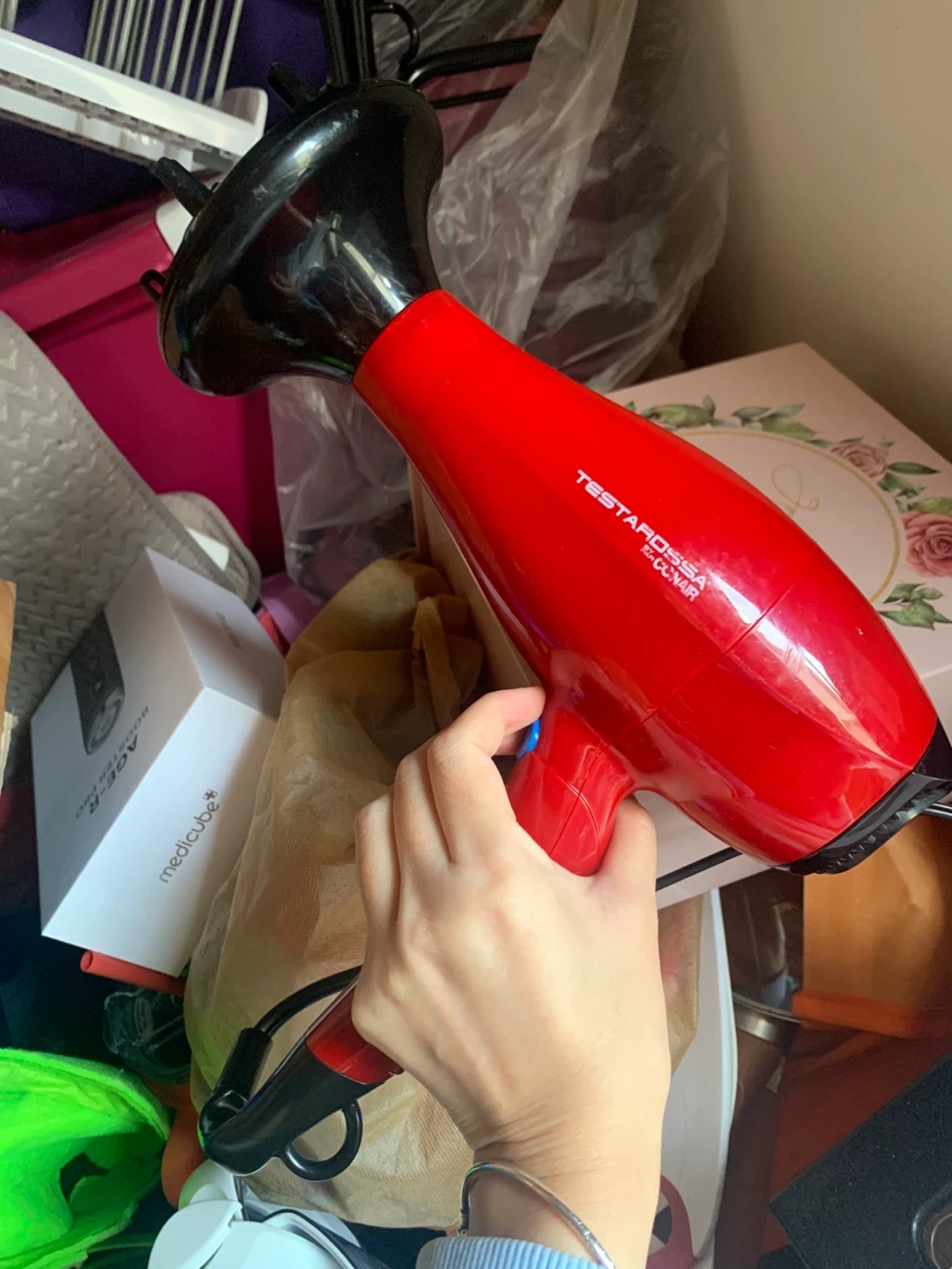 Selling a Testarossa P.Co.Cor hair dryer! It's in good condition and ready for a new home. The hair dryer is red and black, and has a diffuser attachments