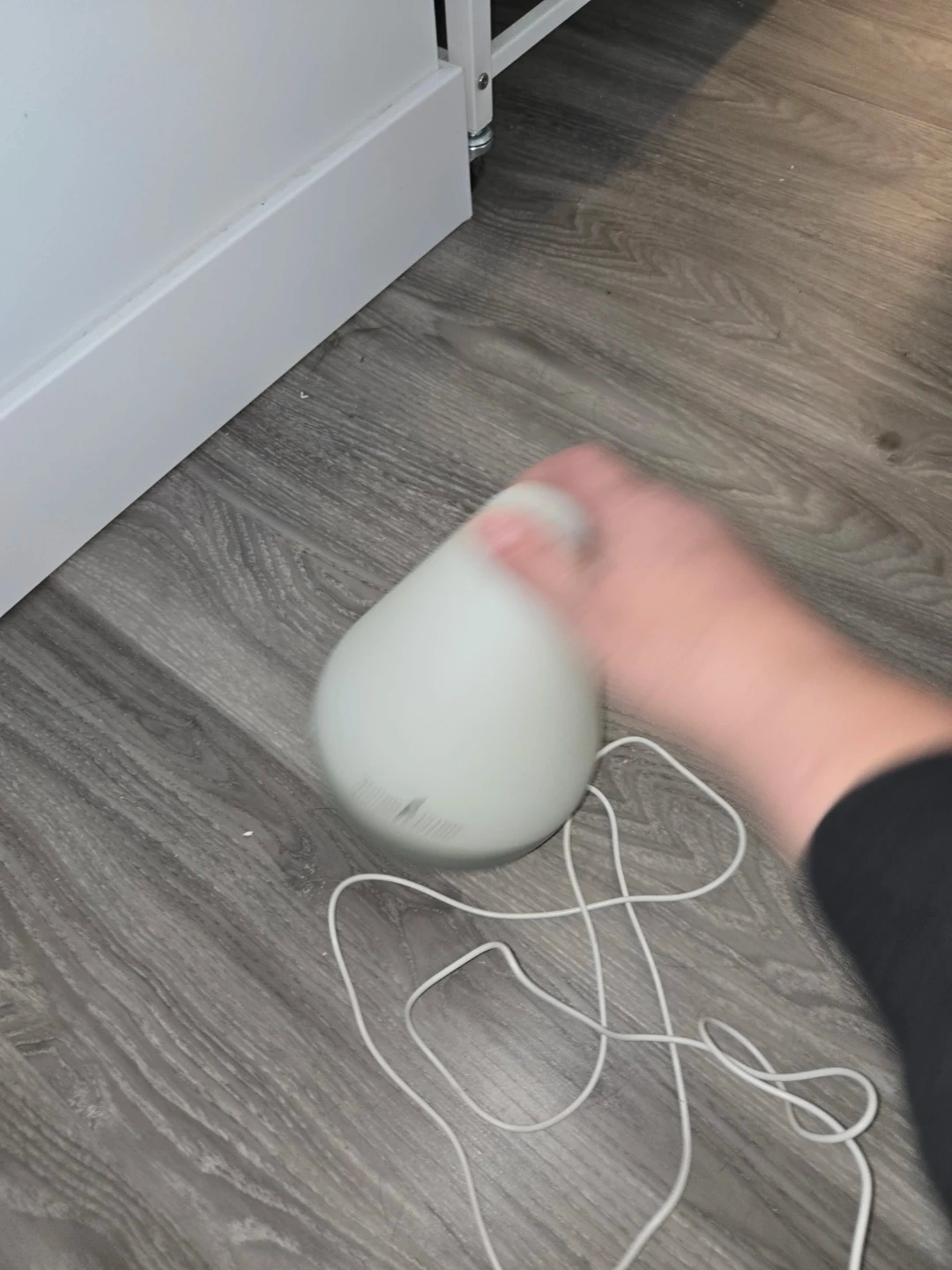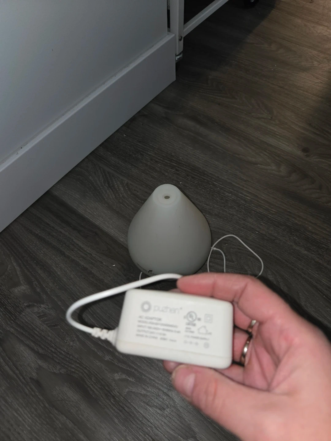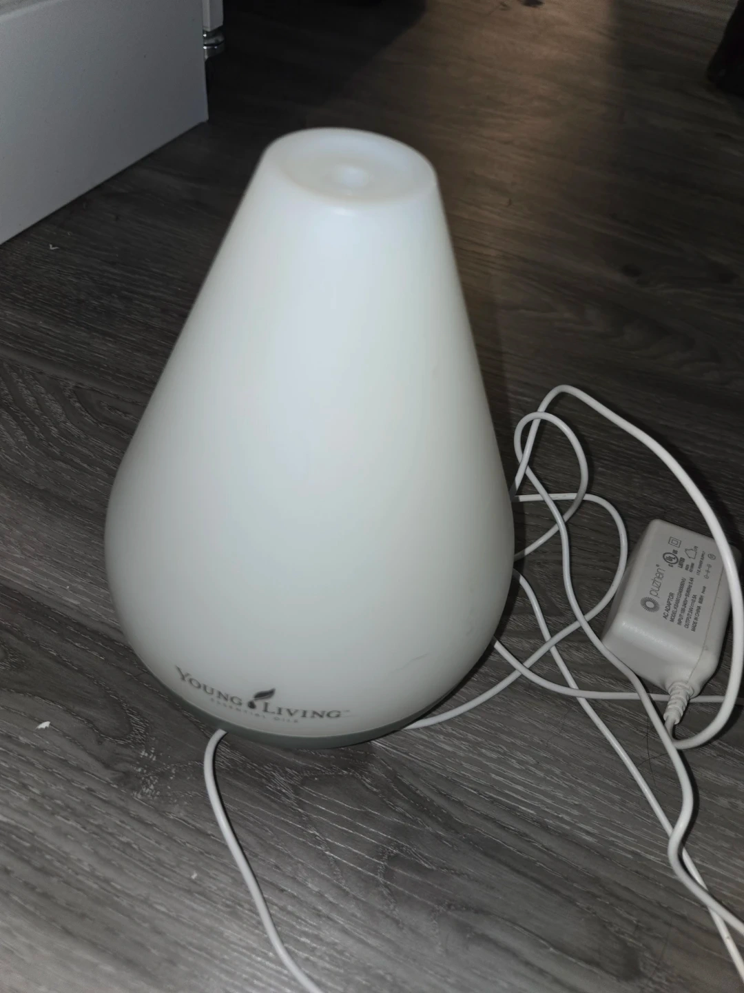 White essential oil diffuser by Young Living. Comes with AC adapter. It's a teardrop shape and made of plastic. This diffuser is great for adding aromatherapy to your space!