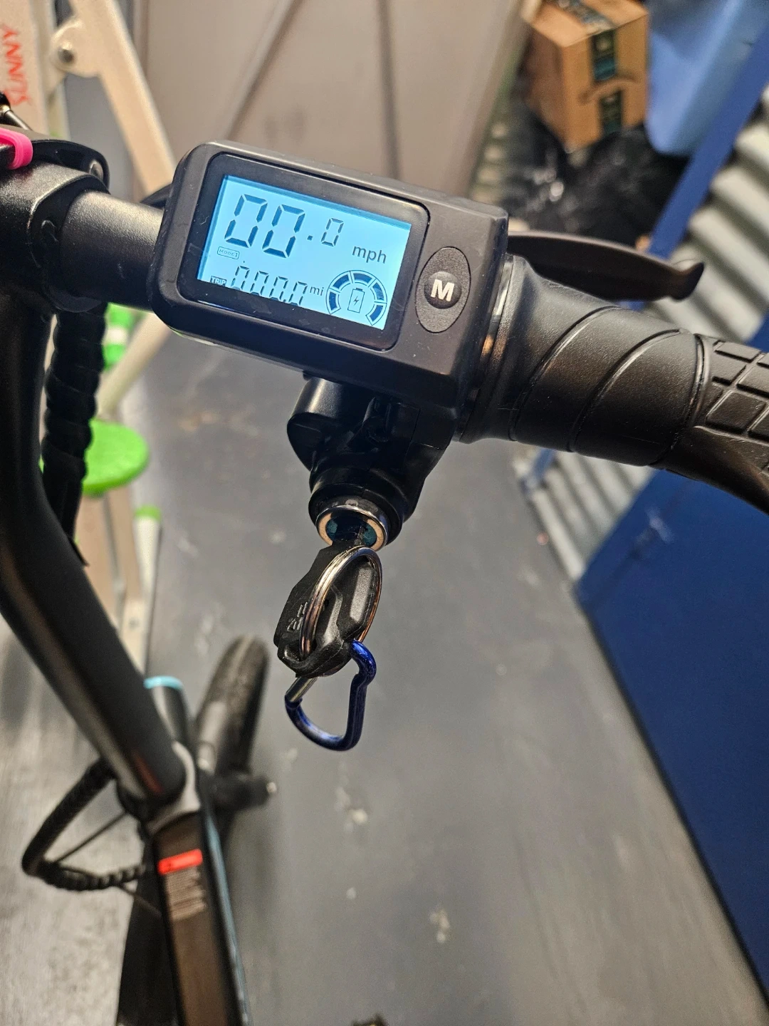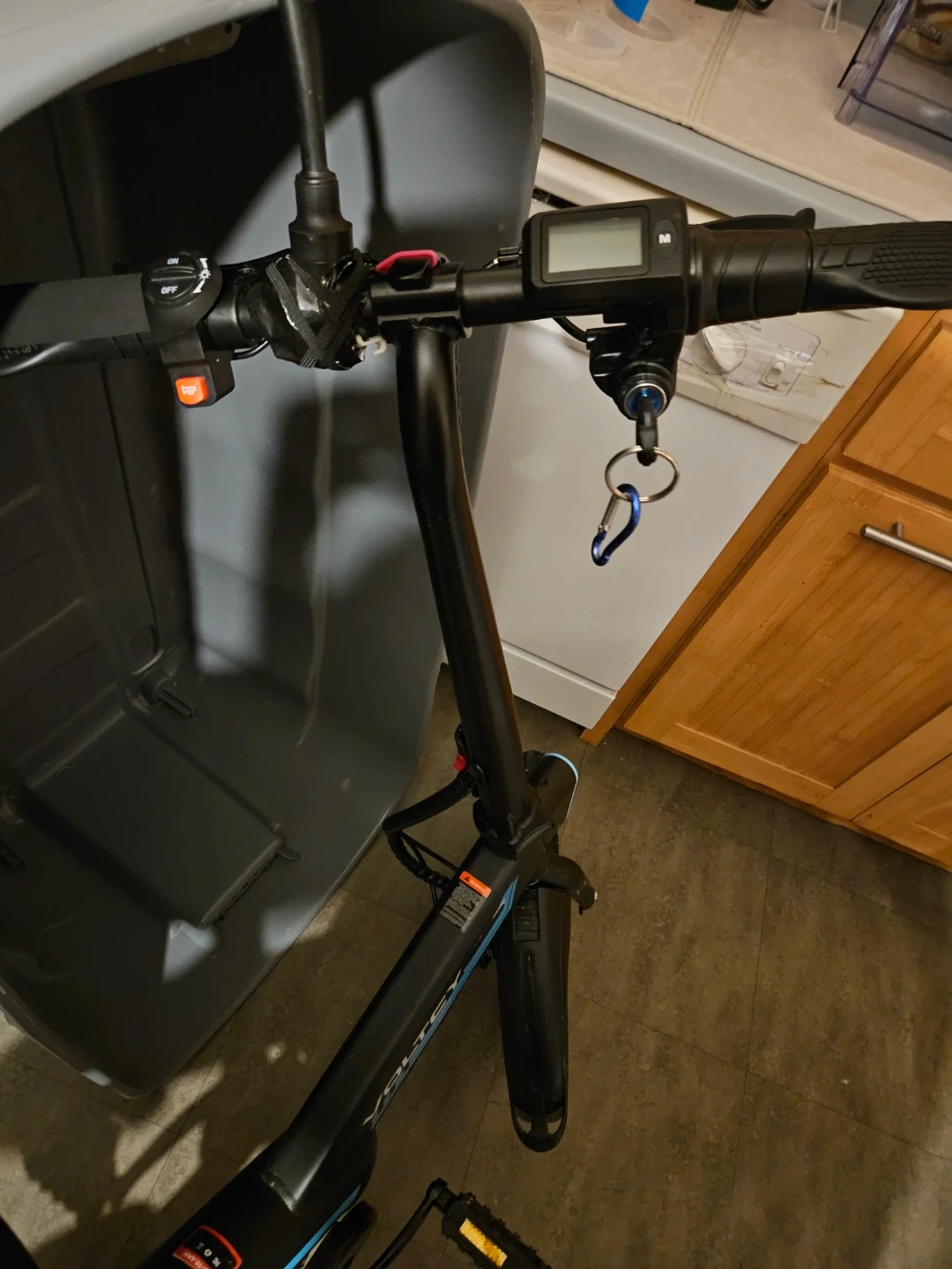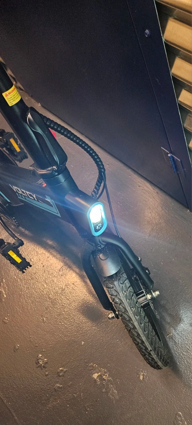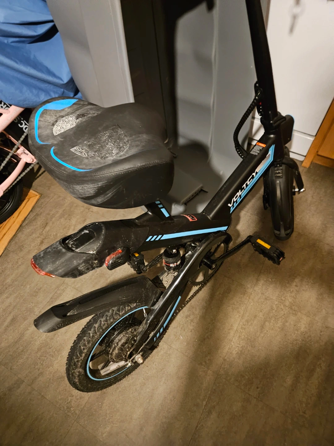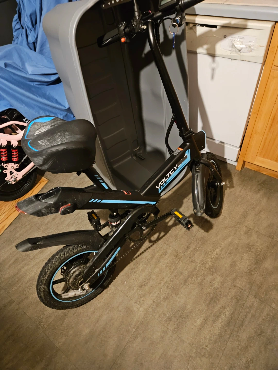 This is a black VOLTCY electric scooter with a comfortable seat. It's designed for urban commuting. Features include a digital display and adjustable handlebars. Great for getting around town quickly!