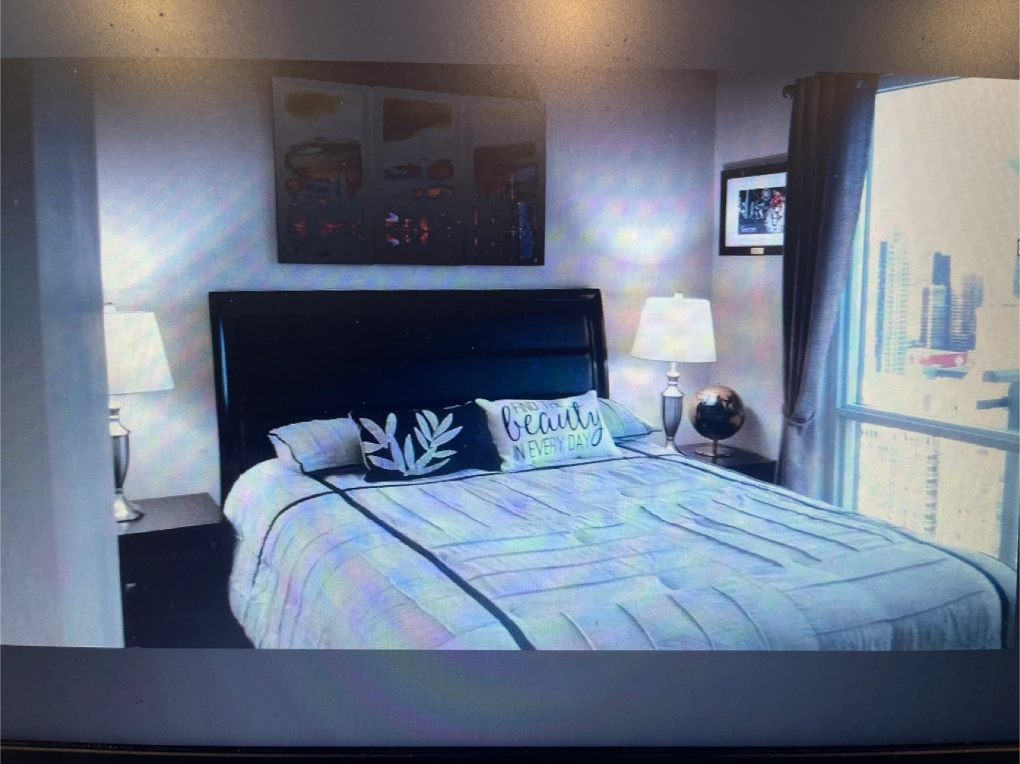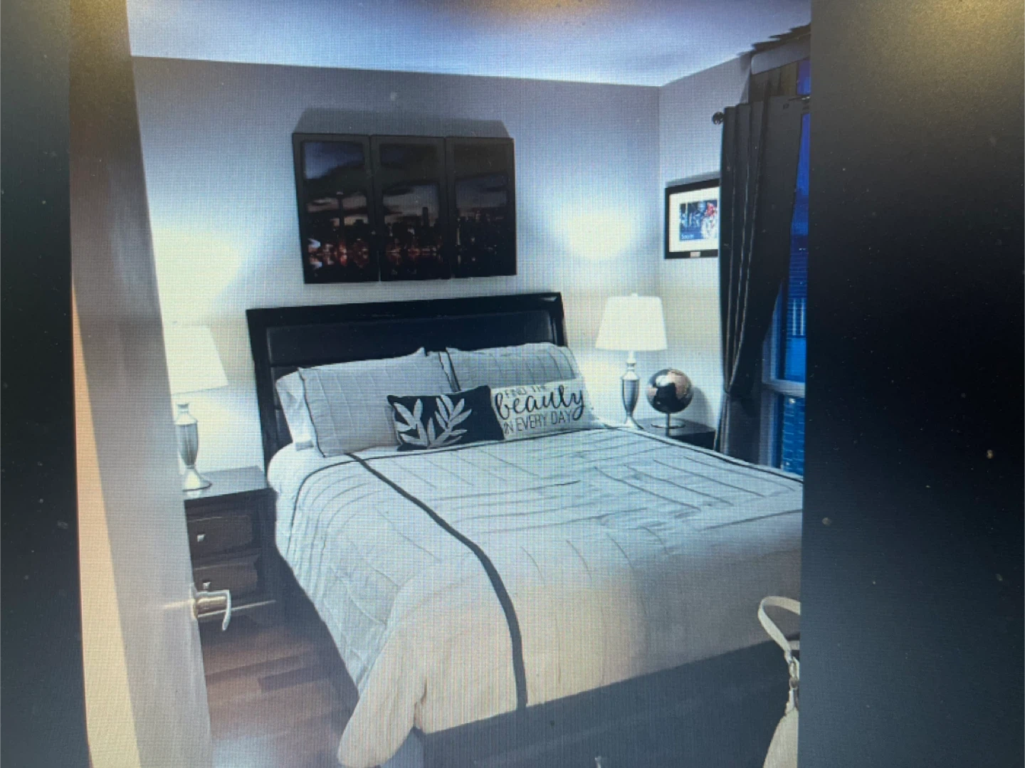 Dark wood queen bed frame with four large storage drawers. Includes headboard and footboard. Modern design fits most bedroom decors.
