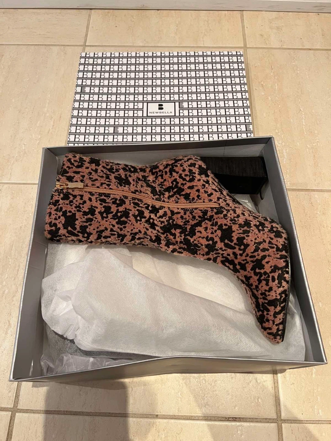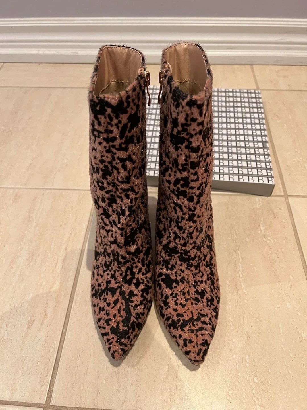 Cute pink and black leopard print ankle boots. These boots have a furry texture and a stylish block heel. They're complete with a side zipper for easy on and off. Add a pop of fun to any outfit!