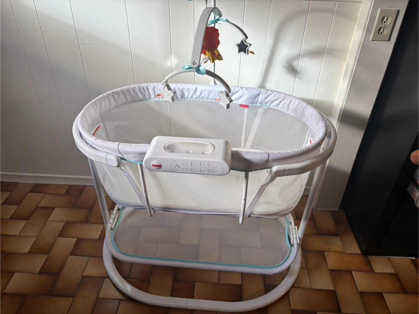 Selling a Fisher-Price Soothing Motions Bassinet! It's in great condition and ready for a new little one. This bassinet gently soothes your baby with calming motions, sounds, and vibrations. It also features a cute mobile to keep your baby entertained. Super convenient and easy to use!