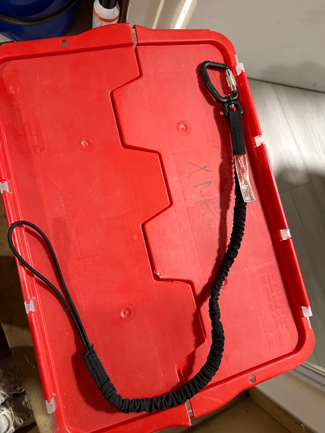 This is a Milwaukee tool lanyard with a carabiner. It has a max capacity of 15 lbs or 6.8 kgs. It's great for securing tools when working at heights.