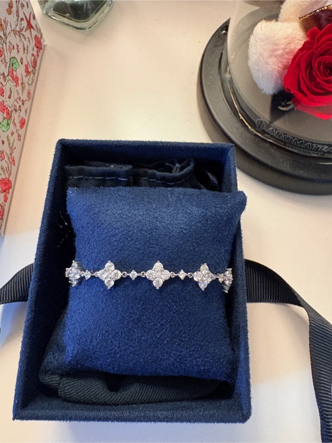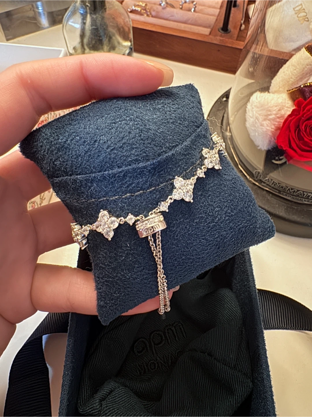 An APM Monaco bracelet with a silver chain and diamond-like stones set in a floral pattern. It's adjustable for a comfortable fit. Comes in original box.