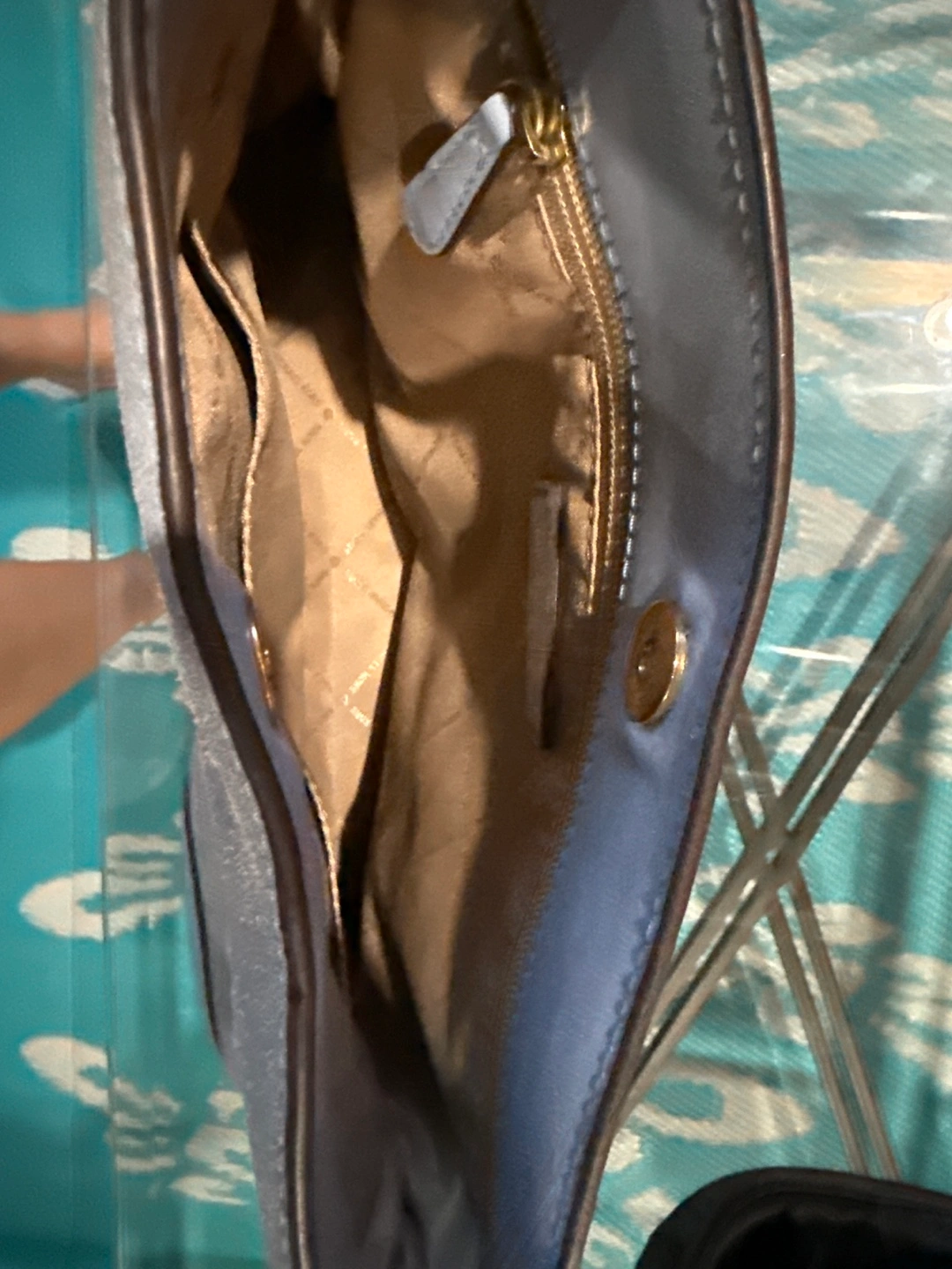 Gorgeous light blue suede shoulder bag. Features a light blue leather accent. Gold-toned hardware. Top handle and spacious interior. Pre-owned. Its been used but no damage other then scratch marks. Very spacious