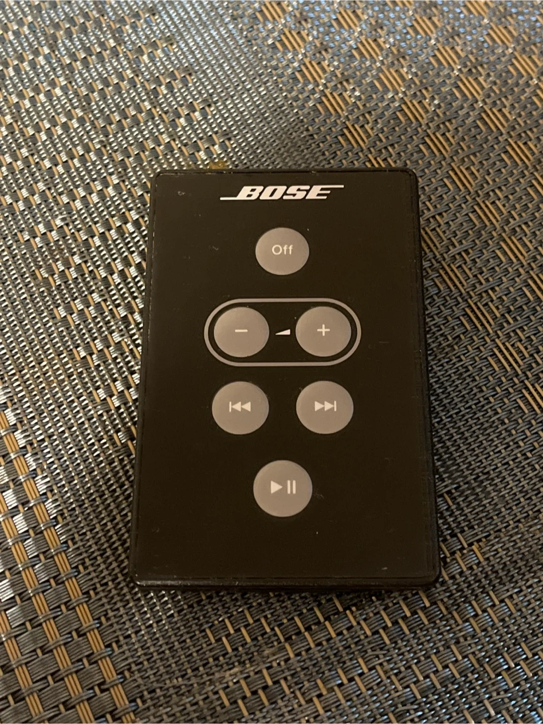 This is a black Bose Soundock 1 remote control. It has buttons for volume adjustment, playback, and power. Perfect for controlling your Bose audio system.