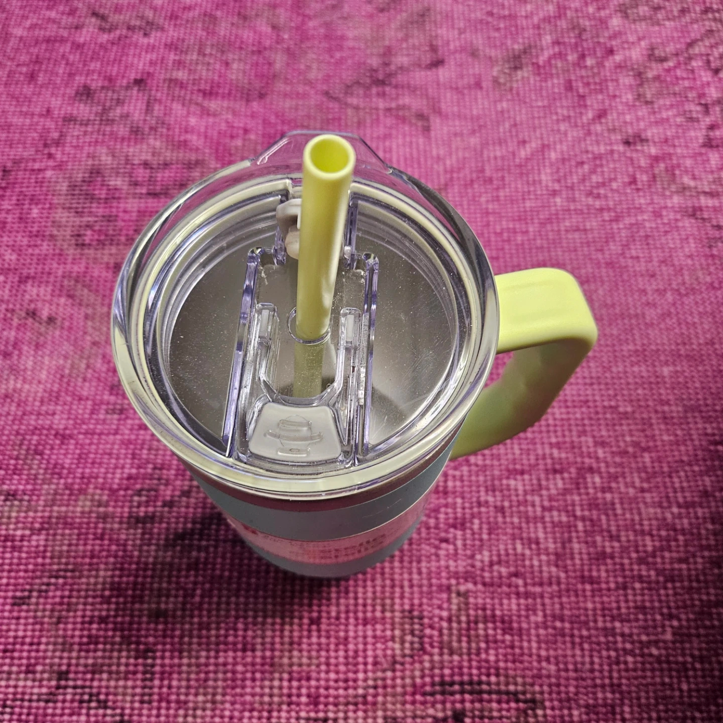 This Stella insulated travel tumbler is made of stainless steel and comes with a straw. It's 1.25L and designed to keep beverages hot or cold. The turquoise tumbler features a comfortable handle and a secure lid. Can be used with or without the straw.