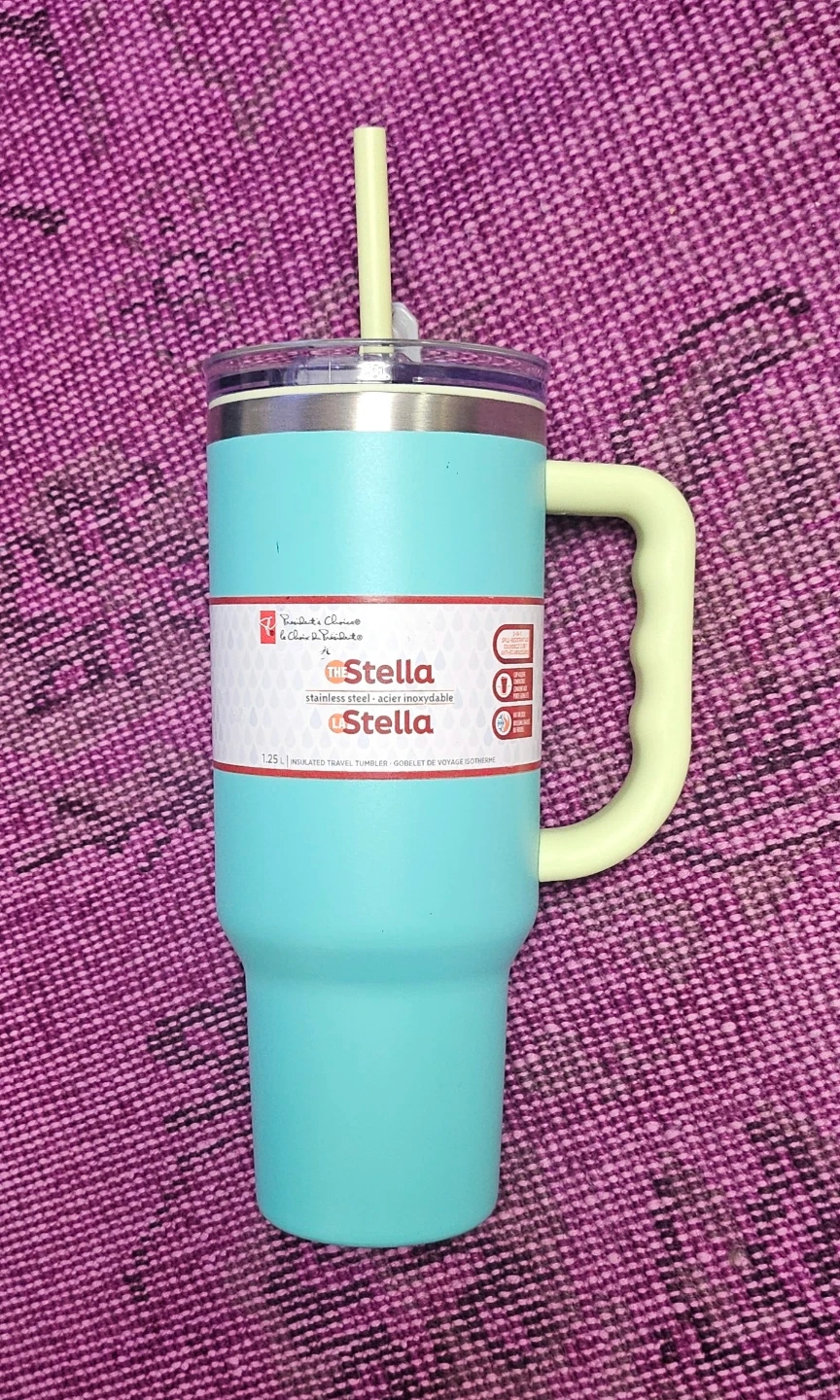 This Stella insulated travel tumbler is made of stainless steel and comes with a straw. It's 1.25L and designed to keep beverages hot or cold. The turquoise tumbler features a comfortable handle and a secure lid. Can be used with or without the straw.