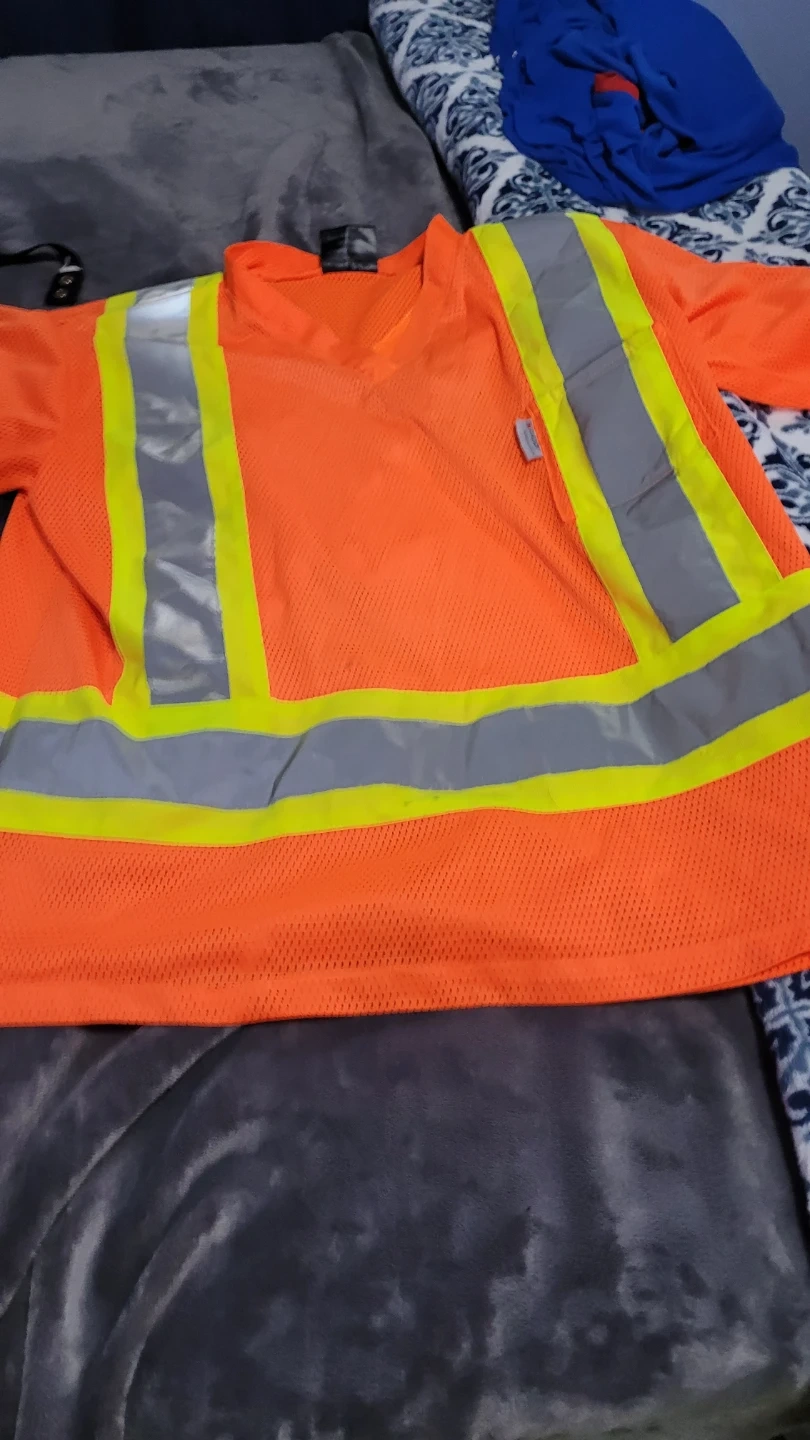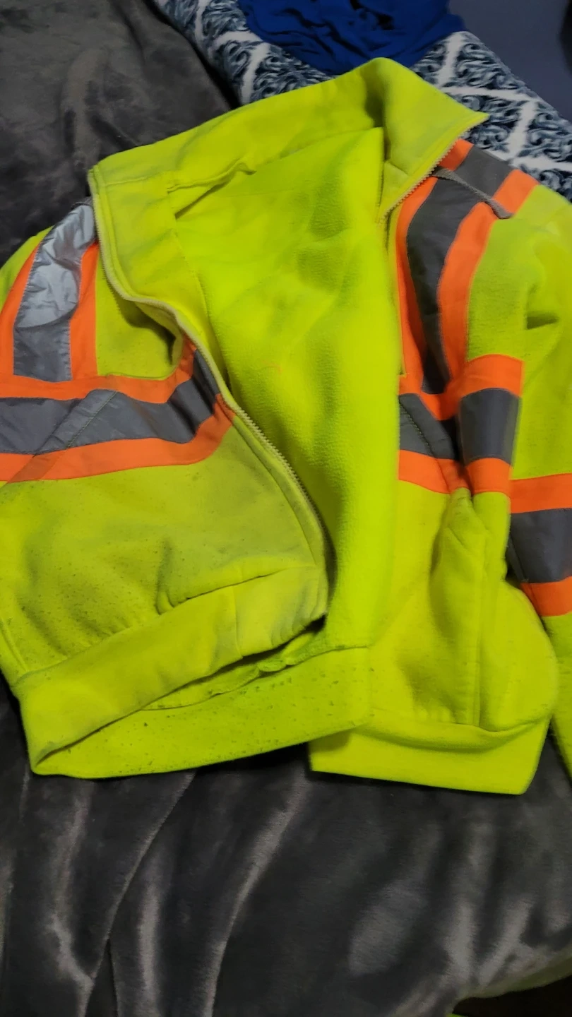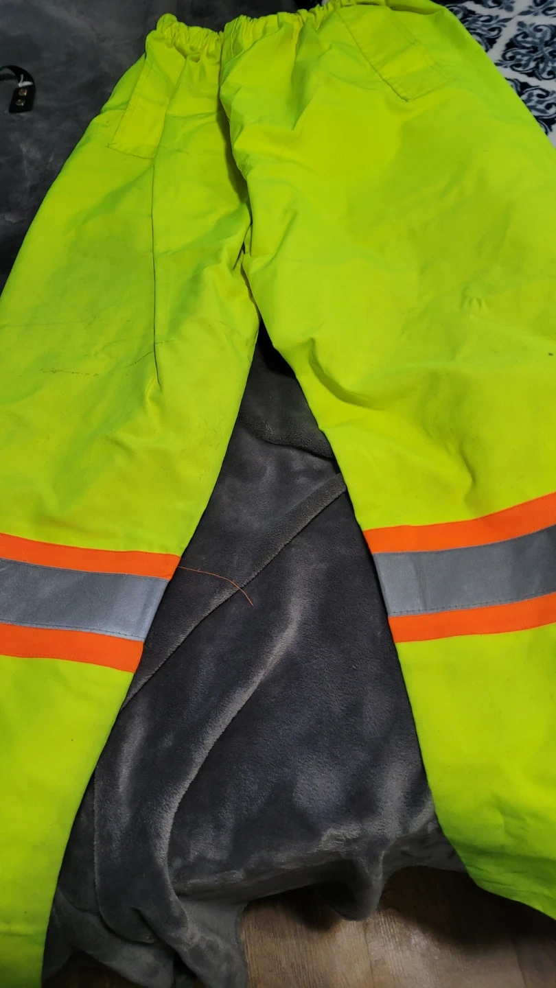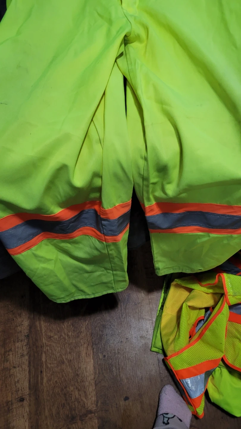 This bundle includes high-visibility work bibs, a safety vest with pockets, and a fleece-lined jacket. All pieces are designed for safety with reflective strips. The bibs and jacket are a bright lime green, while the vest is lime green and orange. There's also rain geart Overalls and jacket. Good condition