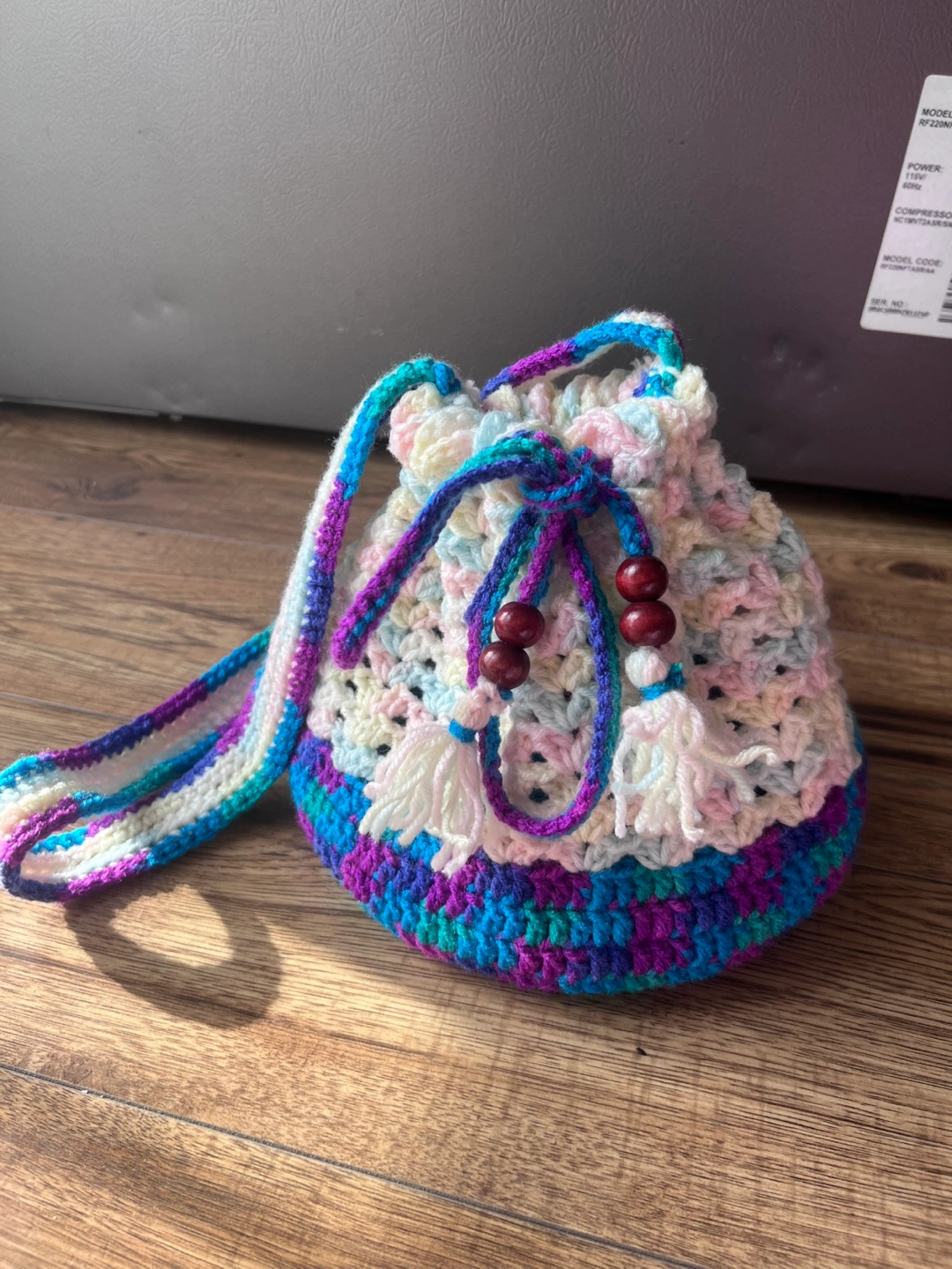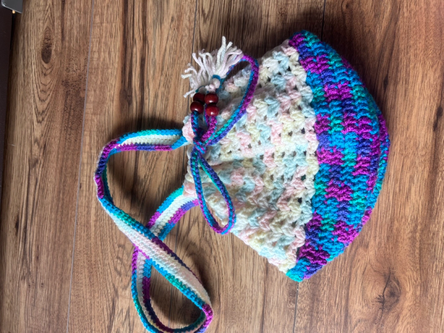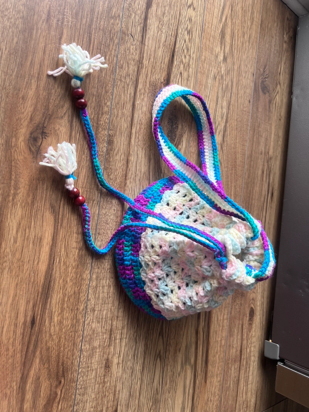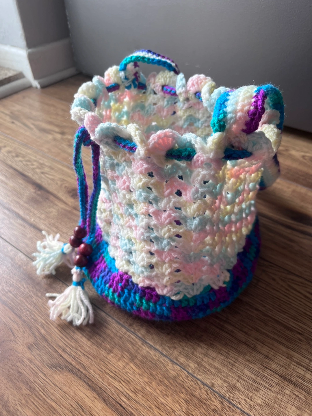 Handmade crocheted drawstring bag with a long strap. The bag is multicoloured with white, pink, blue, green, and purple. It features wooden beads and tassels.