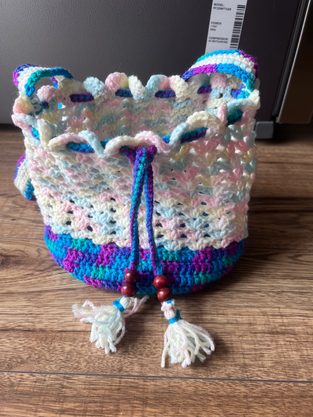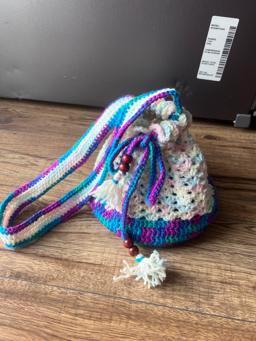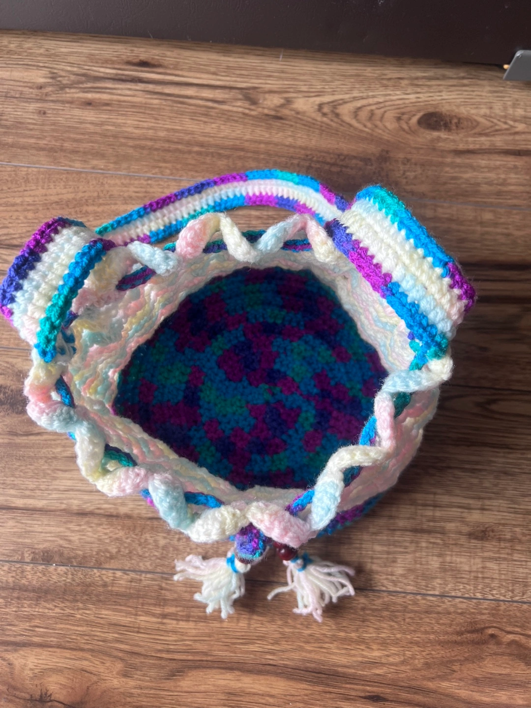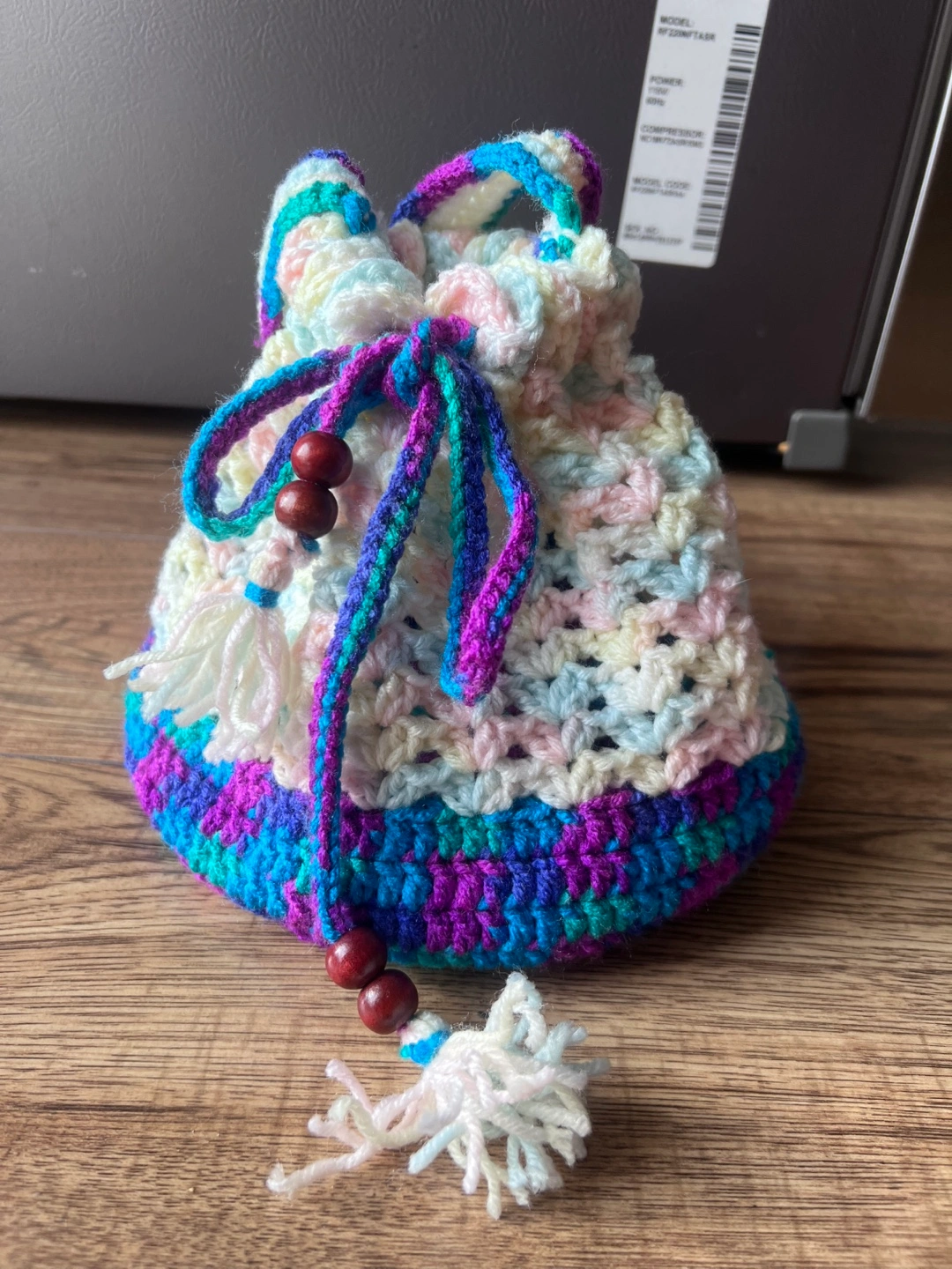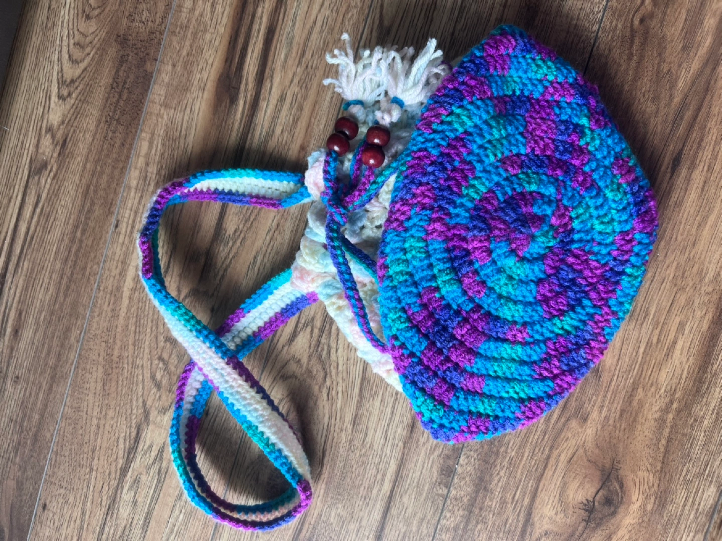 Handmade crocheted drawstring bag with a long strap. The bag is multicoloured with white, pink, blue, green, and purple. It features wooden beads and tassels.