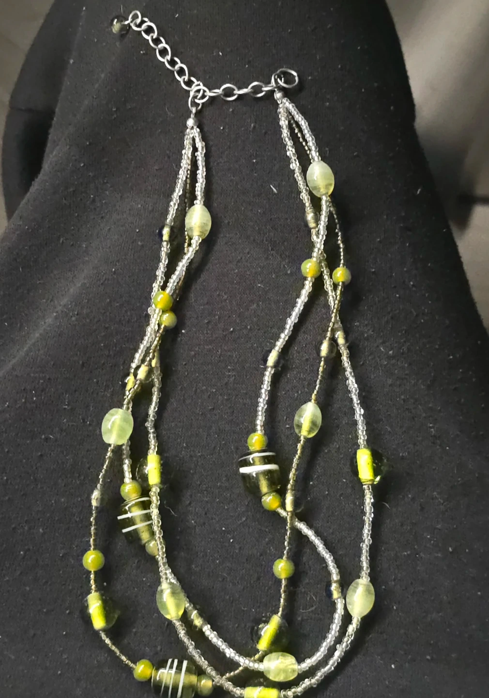 This is a multi-strand necklace with green and clear beads. It features a silver-tone extender chain for adjustable length. It's great for adding a pop of colour to any outfit!