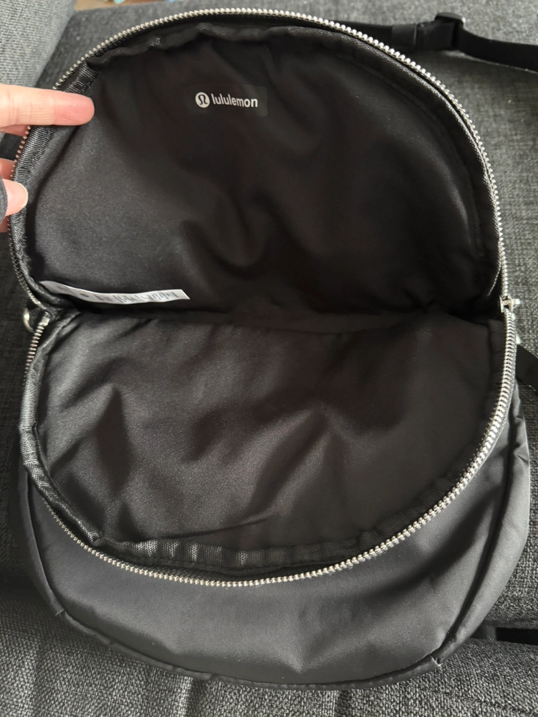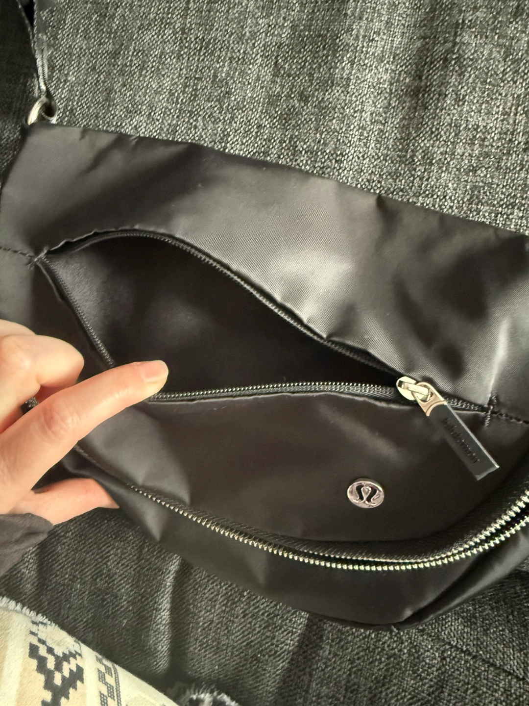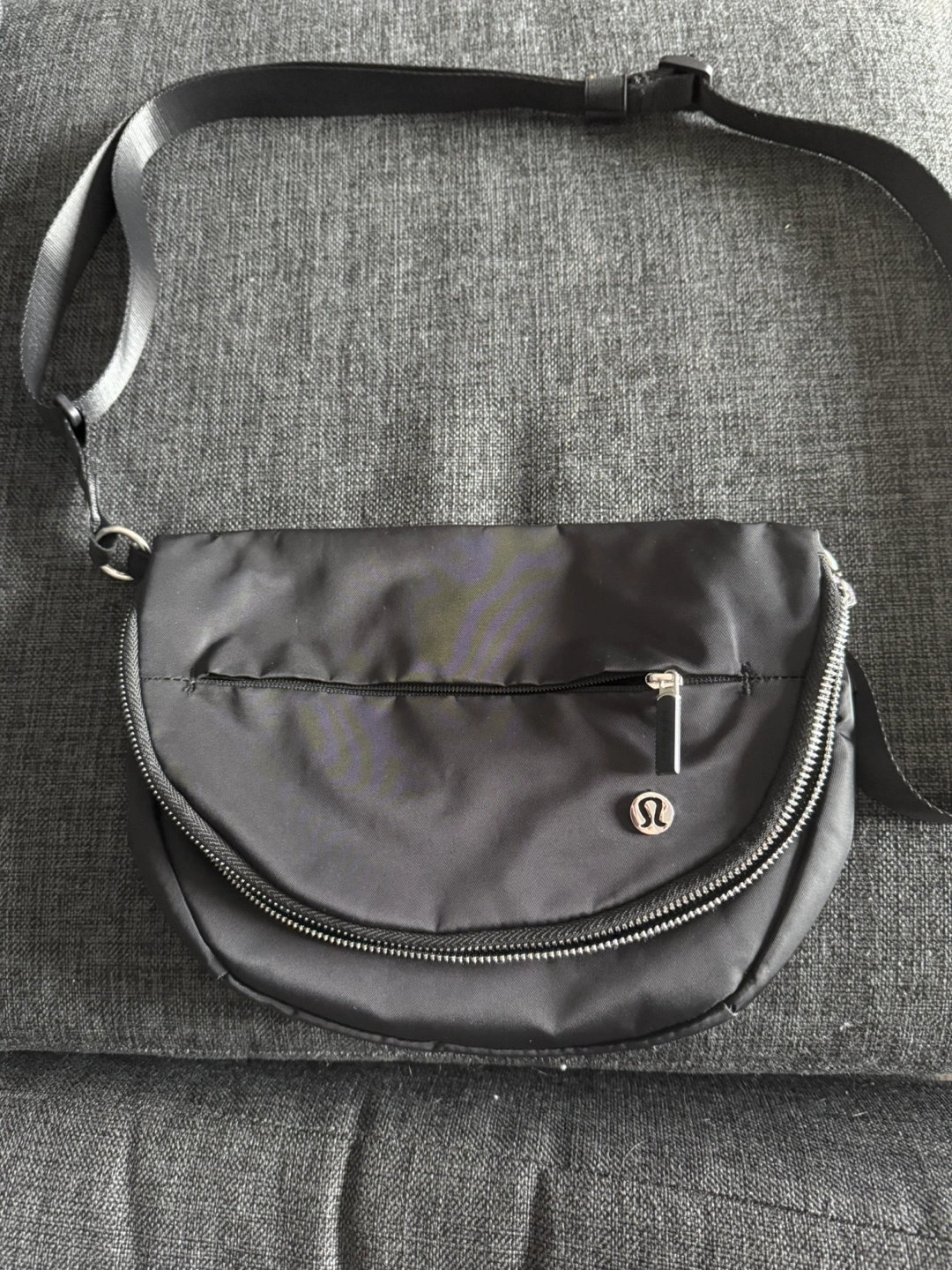 Black Lululemon all night festival bag 5L. Has lots of pockets and space to fit all your daily needs and more. Has a zippered pocket on the front and a small slip pocket inside. Adjustable strap.
