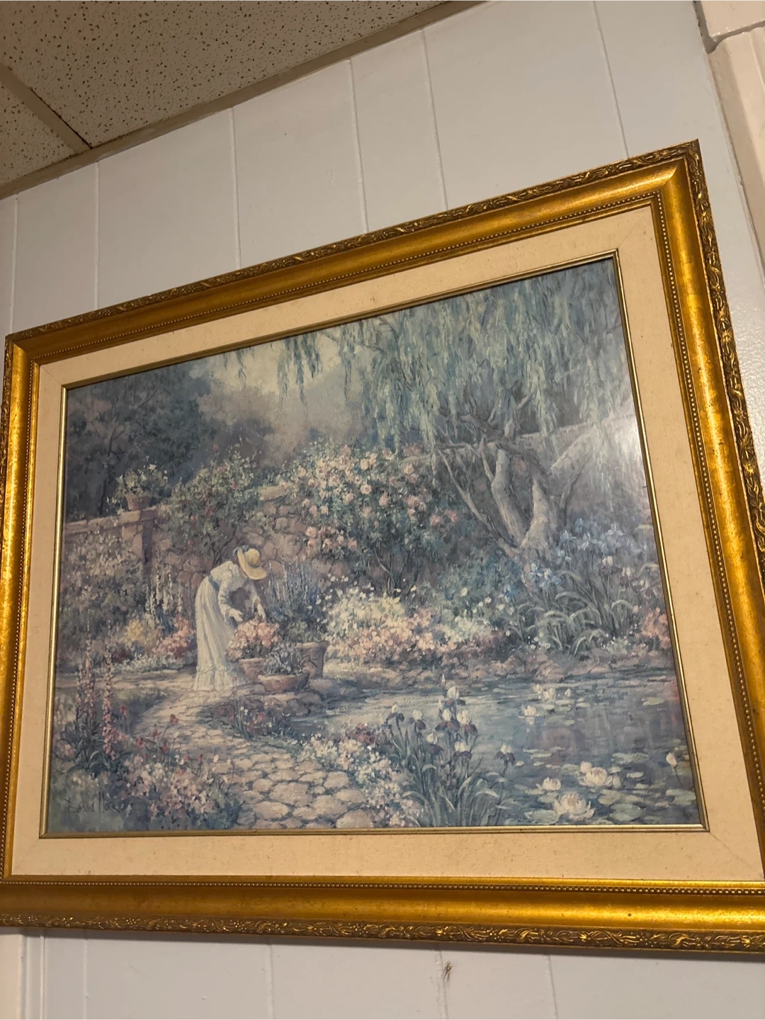 A beautiful framed print of a serene garden scene with a woman tending to flowers. The artwork features a tranquil pond with lily pads and a weeping willow tree. It's housed in an ornate gold-colored frame.