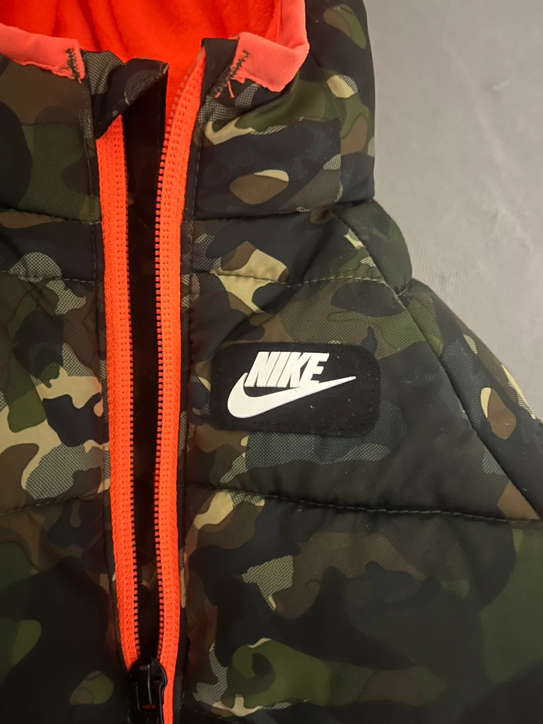 This is a Nike baby snowsuit. It's a camouflage design with bright orange trim and lining. Size is 3M (56-62CM).