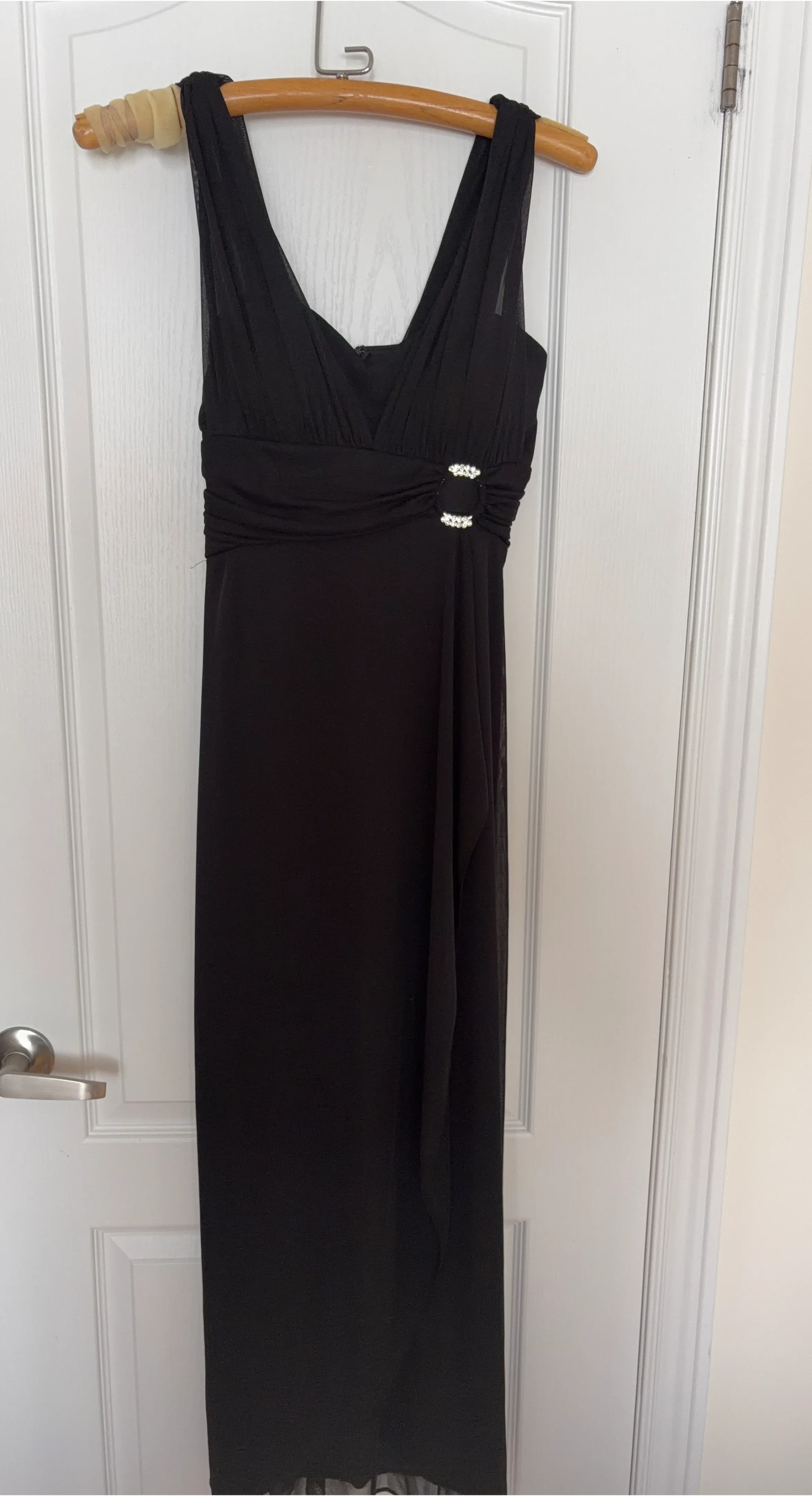 This elegant black maxi dress features a flattering V-neckline and a ruched waist with sparkling rhinestone embellishments. Sheer overlay detail adds a touch of sophistication. Perfect for formal events or evening wear!