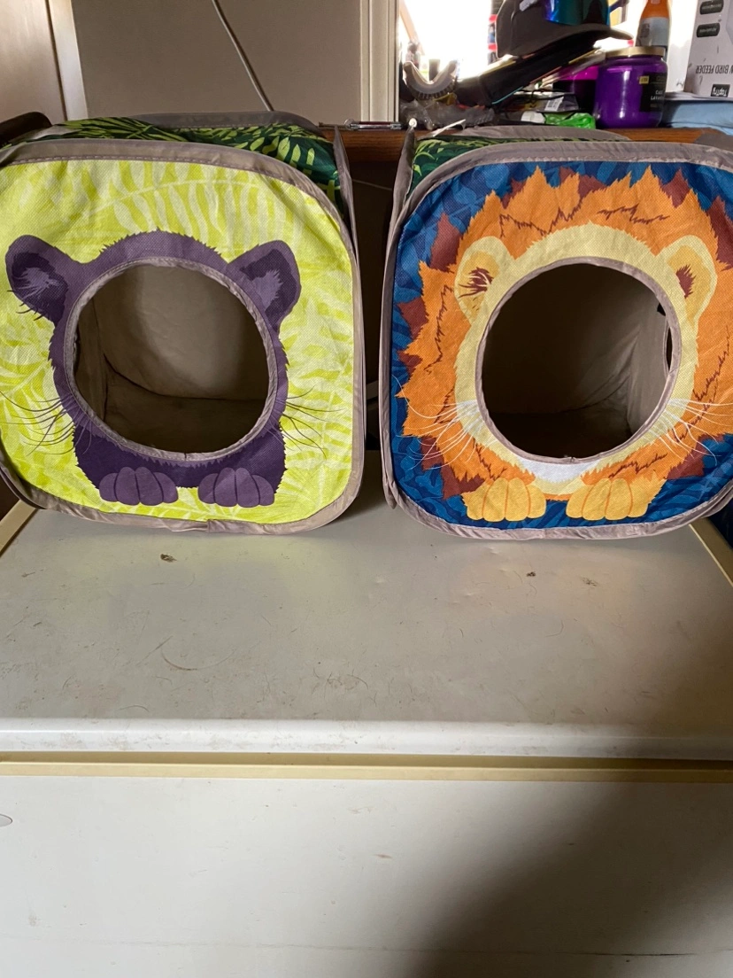 2 animal themed cat cubes. My cat used them a few times then decided she didn’t like them anymore. They have Velcro on the open ends to attach other things to them. Still in great condition. $7 for both.