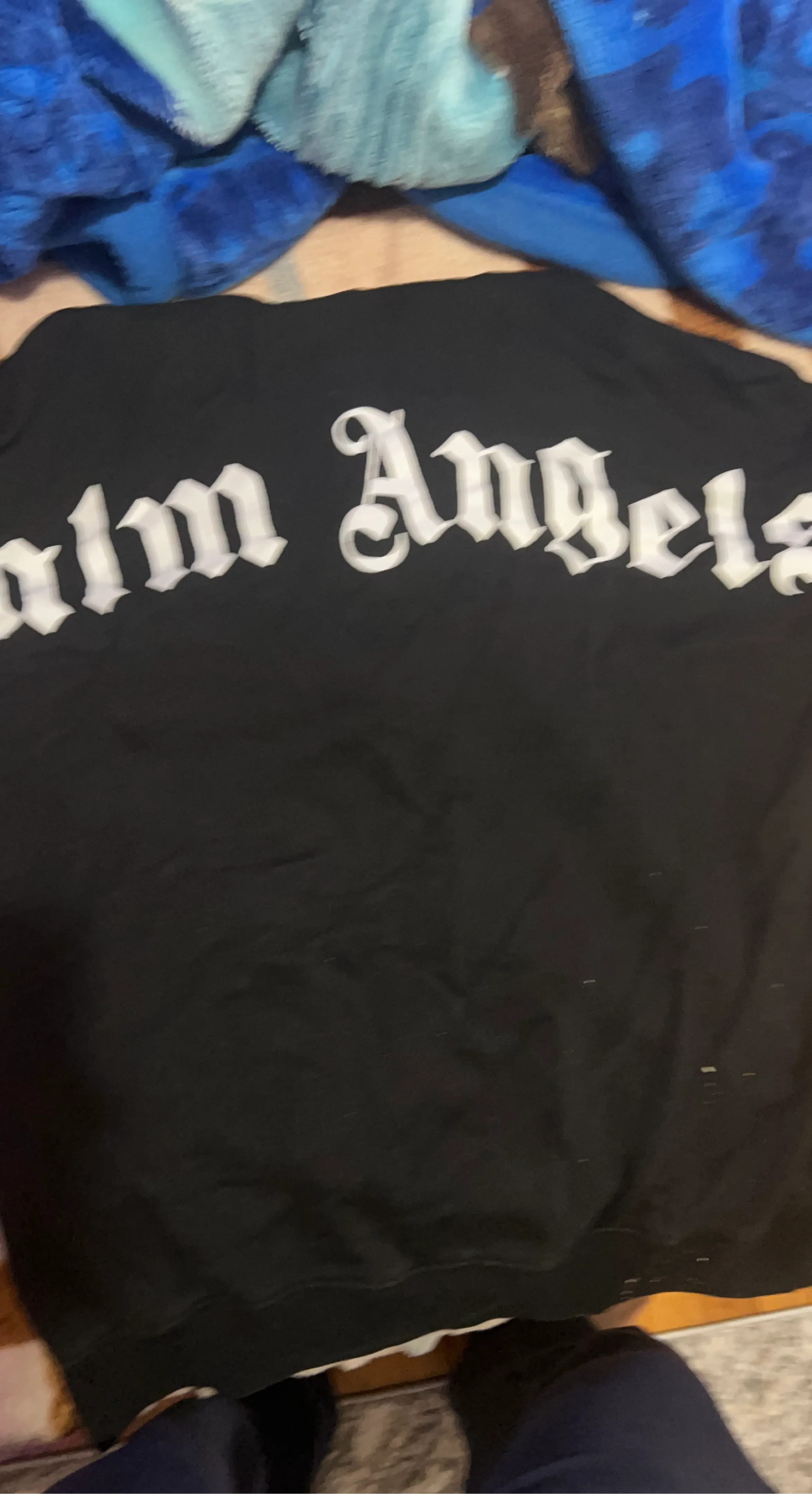 This is a black Palm Angels crewneck sweatshirt. It features the brand's signature gothic font logo printed in white on the back. Made from comfortable fabric.