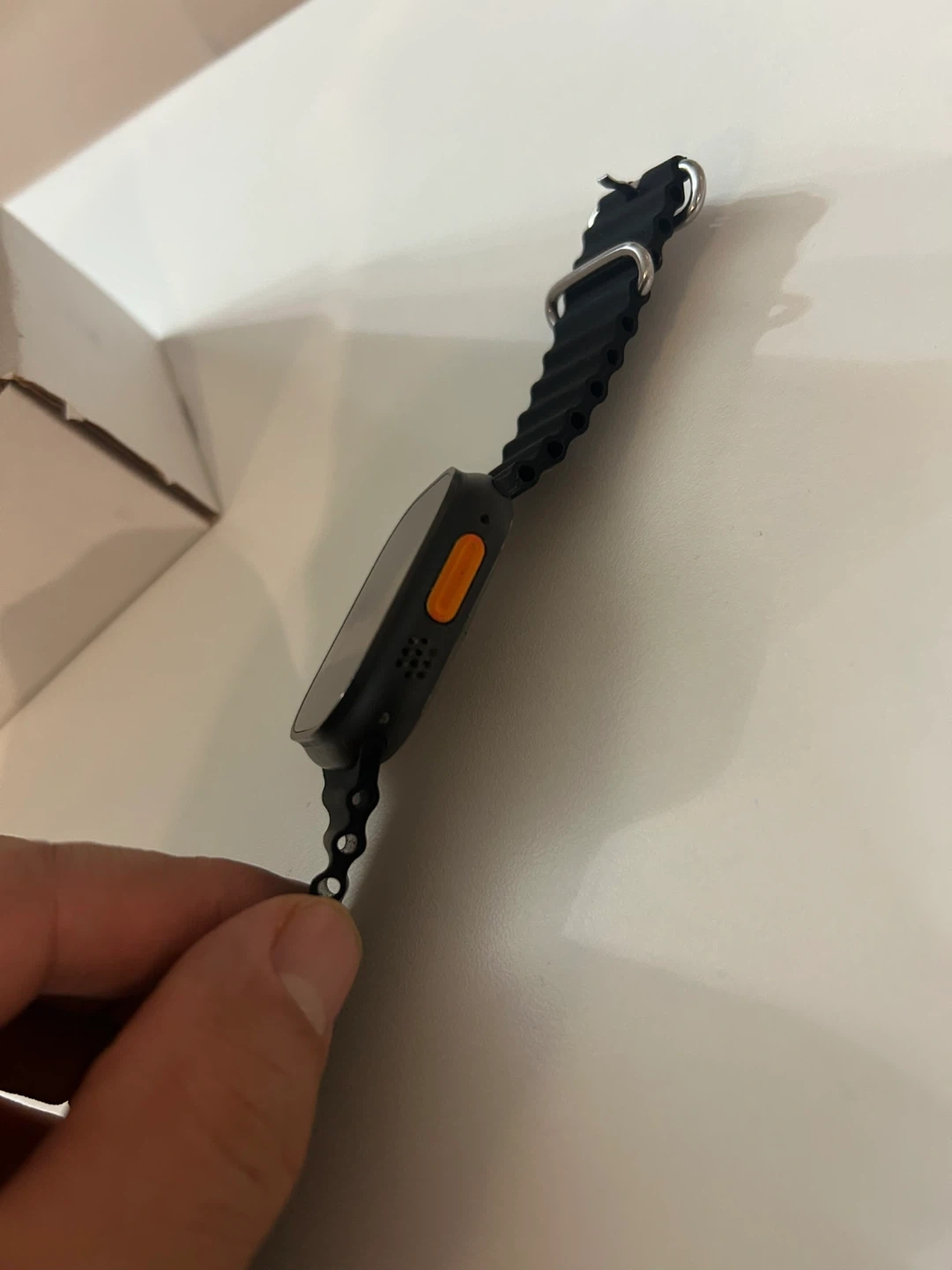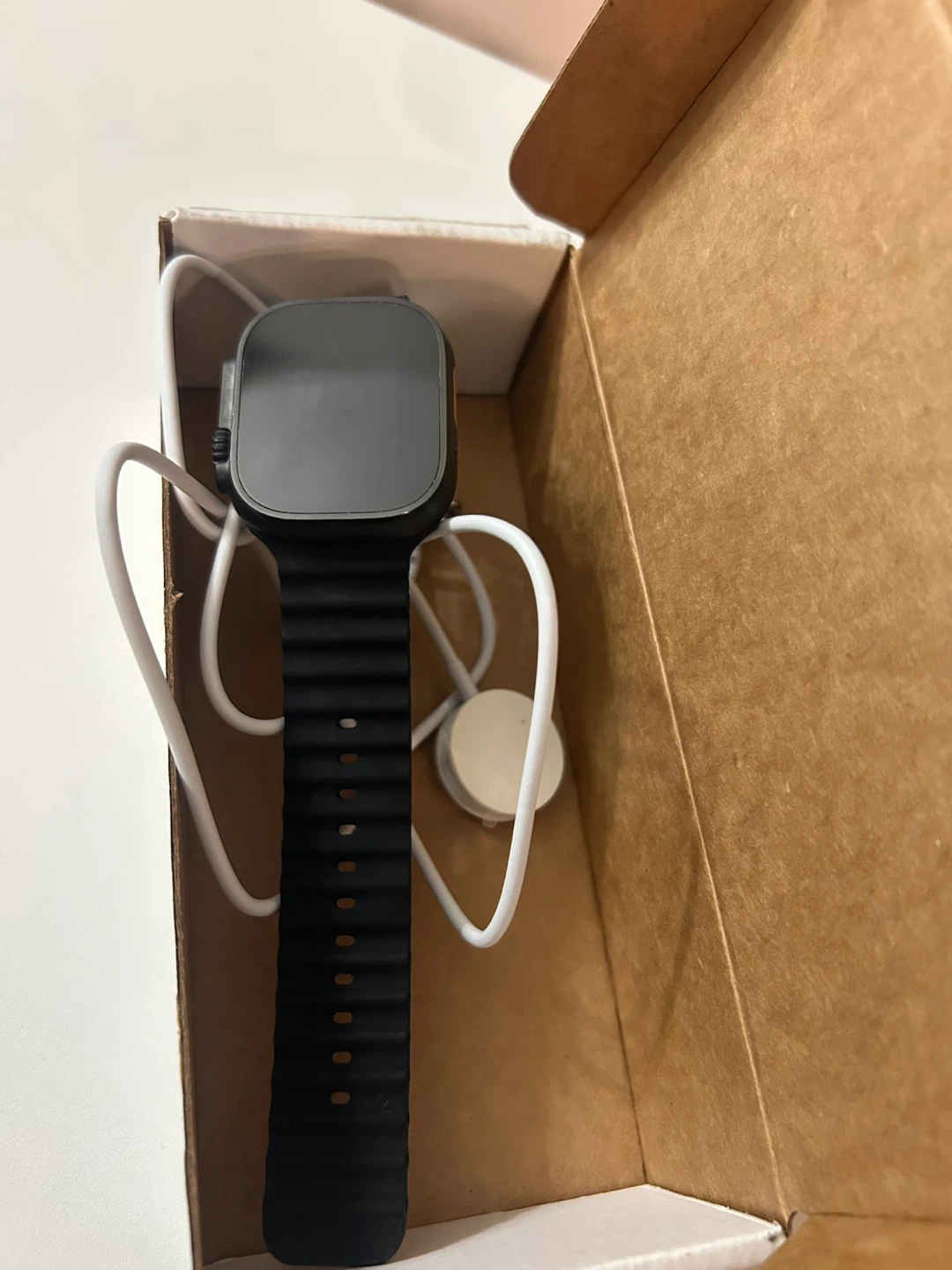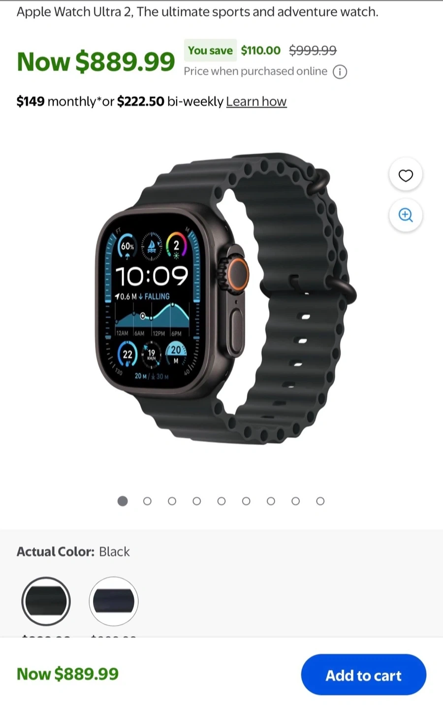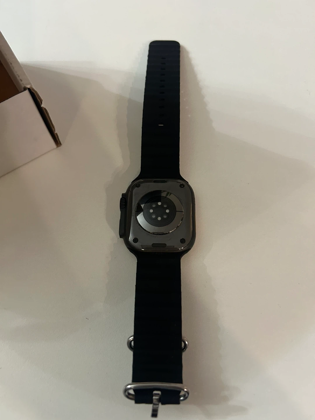 Apple Watch Ultra 2 with Black Titanium case and Black Ocean Band. This watch is renewed. It's the ultimate sports and adventure watch with GPS and cellular capabilities.