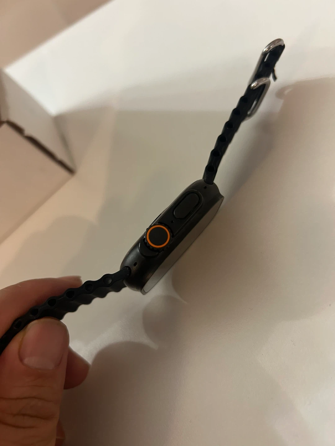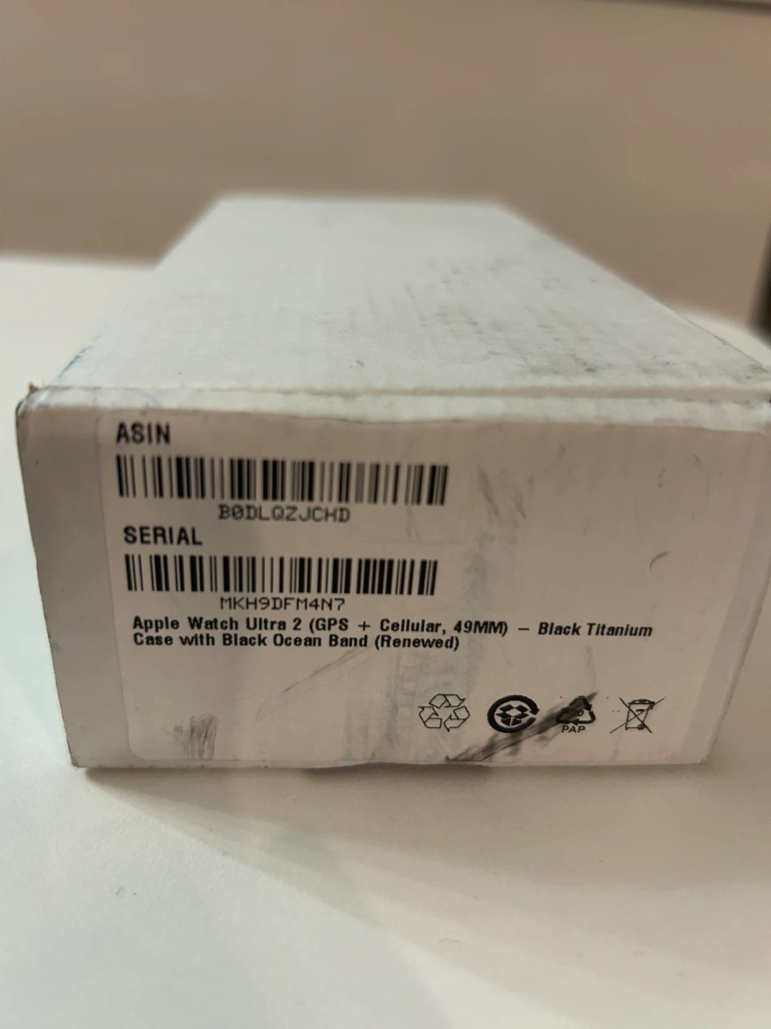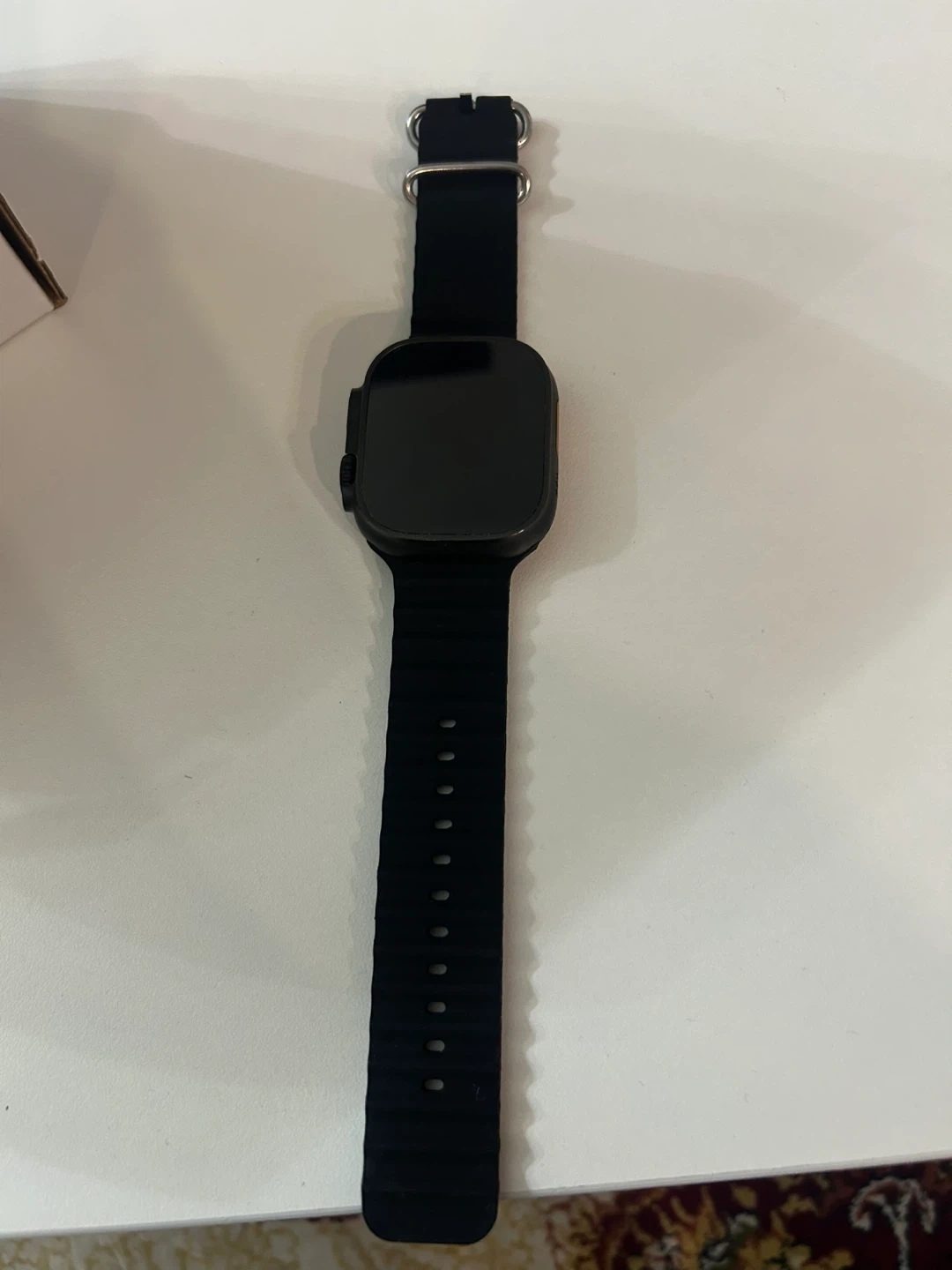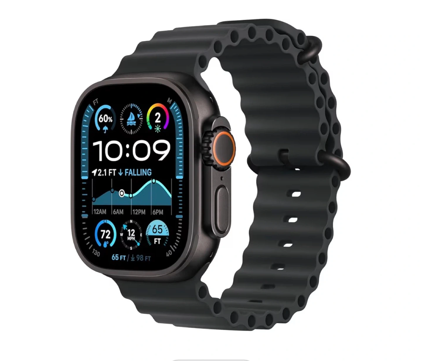 Apple Watch Ultra 2 with Black Titanium case and Black Ocean Band. This watch is renewed. It's the ultimate sports and adventure watch with GPS and cellular capabilities.