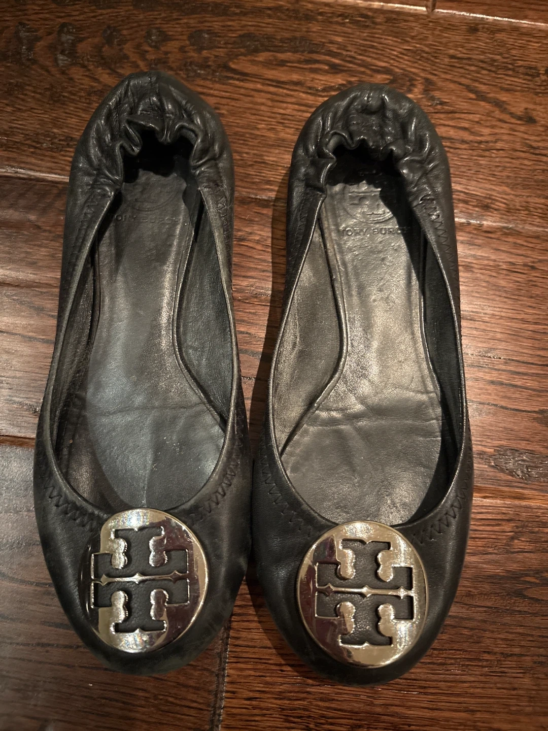 Black leather ballet flats from Tory Burch. Features a gold-tone double 'T' logo emblem. These shoes are designed for everyday wear.