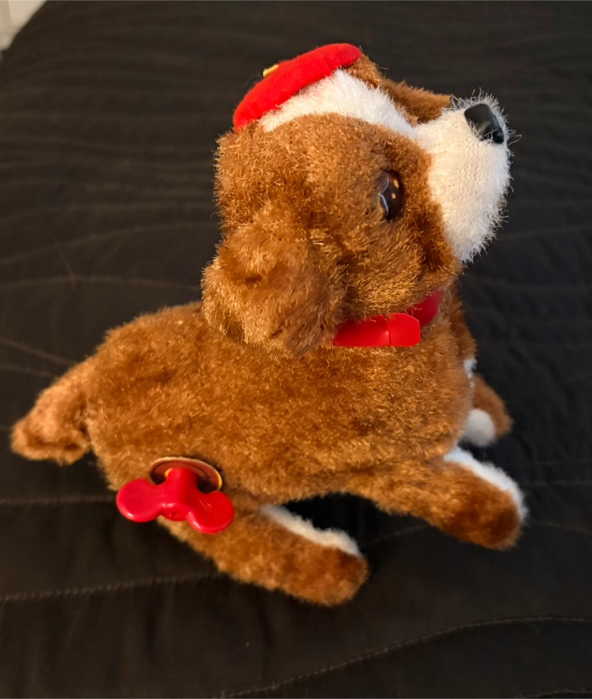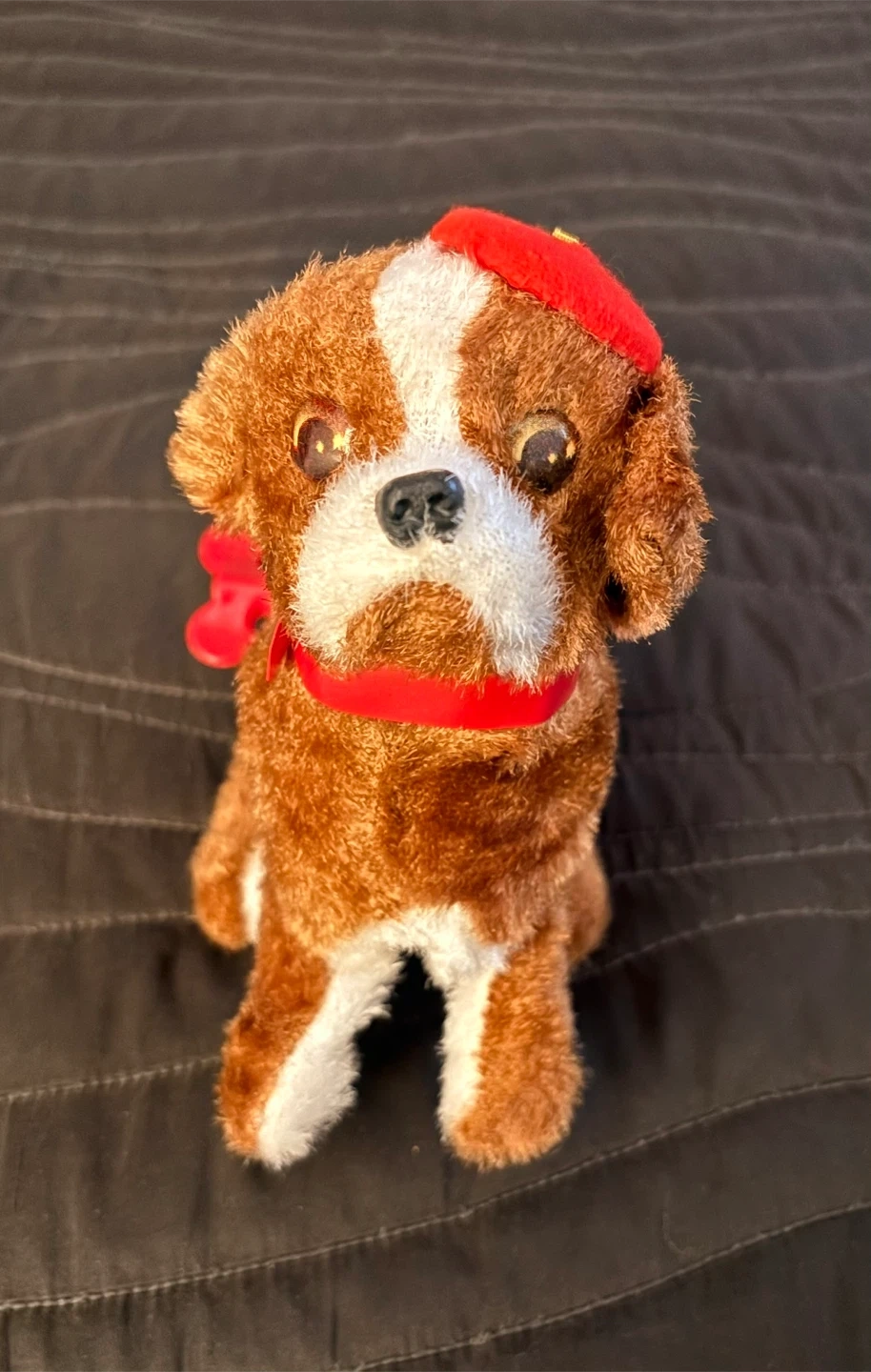 Selling a cute vintage wind-up plush dog toy! It's in good condition and ready for a new home. This little guy is brown with a red collar and hat, and he's sure to bring a smile to your face.