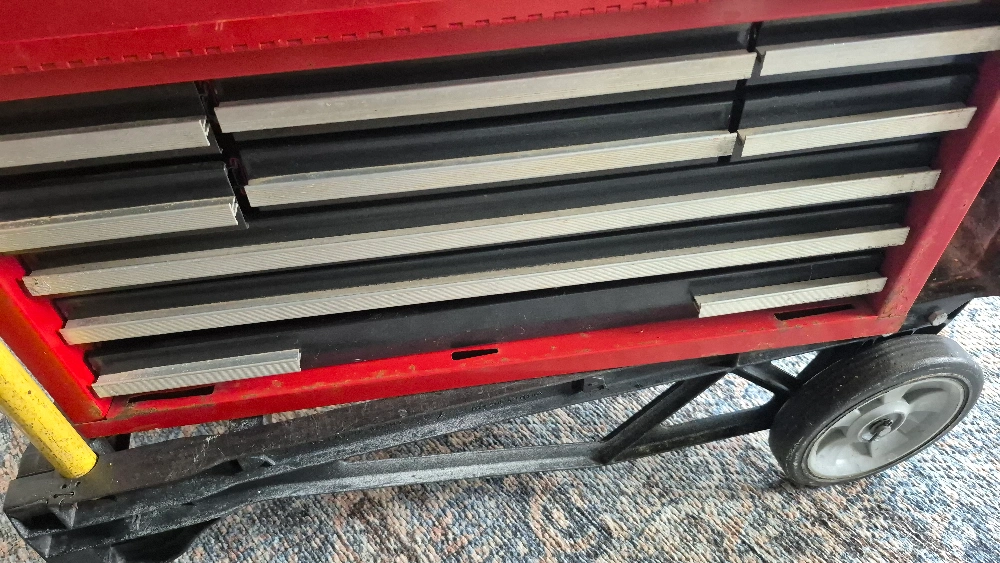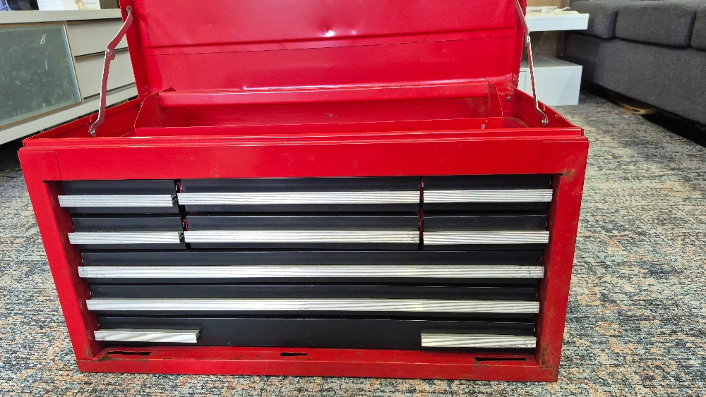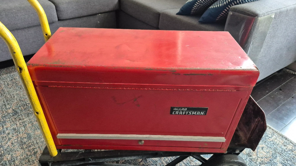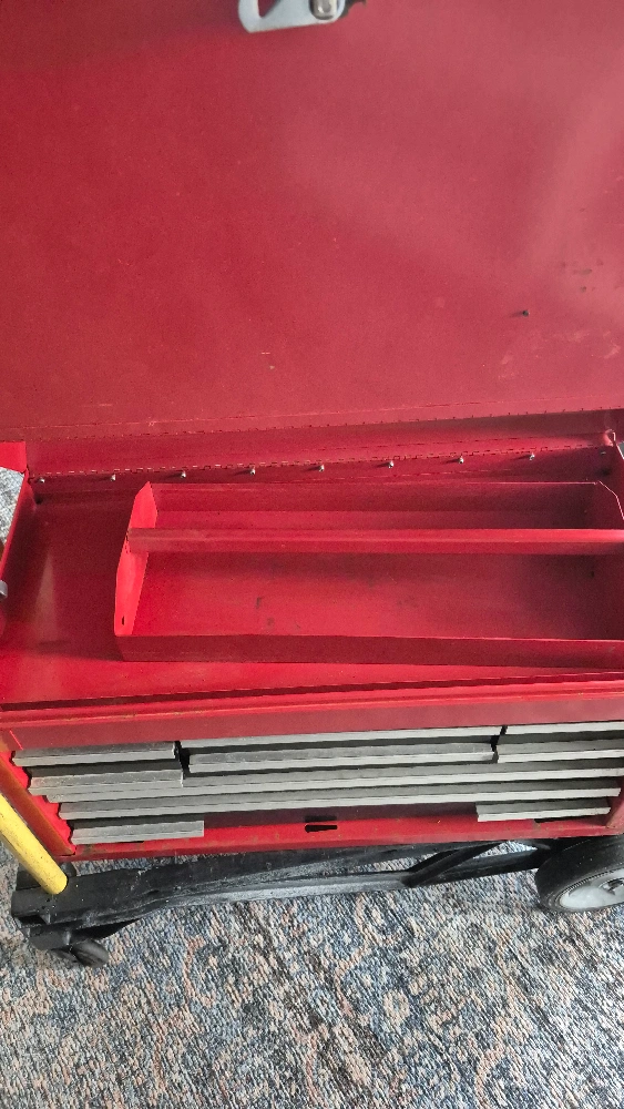 Selling a red Craftsman tool chest. It has multiple drawers for organizing your tools. It shows some signs of use, but it's still very functional and ready to help you keep your workspace tidy!