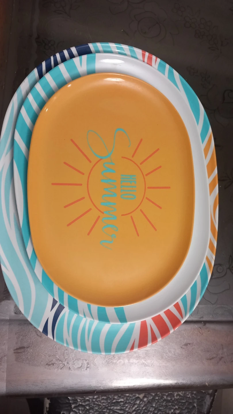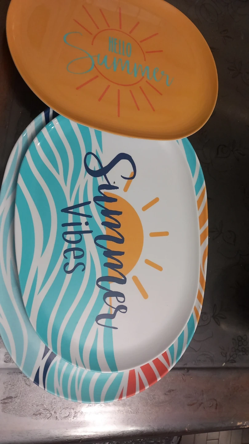 This set includes three oval plates with cheerful summer designs. The largest plate features a 'Summer Vibes' sun graphic, and the other two have wavy ocean-inspired patterns.